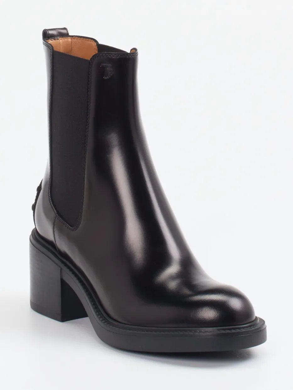 Minimalistisch. Markant. Modern.Tod’s interpretiert die klassische Chelsea-Stiefelette neu – elegant und puristisch zugleich. Schwarzes Hochglanzleder trifft auf ein knöchelhohes Design mit tonalen Elastikeinsätzen und dezenter Logoprägung am Schaft. Die gummierten Noppen an der Ferse sorgen nicht nur für Traktion, sondern erinnern an stilprägende Details der Marke. Der Blockabsatz von 5,5 cm verleiht eine feminine Silhouette, während die profilierte Leichtzellsohle Komfort im urbanen Alltag bietet. Modisch eingebettet in Trends wie „Quiet Luxury“, eignet sich das Modell für Business wie Freizeit. Empfehlenswert zu schmalen Hosen und strukturiertem Wollmantel. Premium-Handwerk für anspruchsvolle Looks mit diskretem Luxusgefühl.