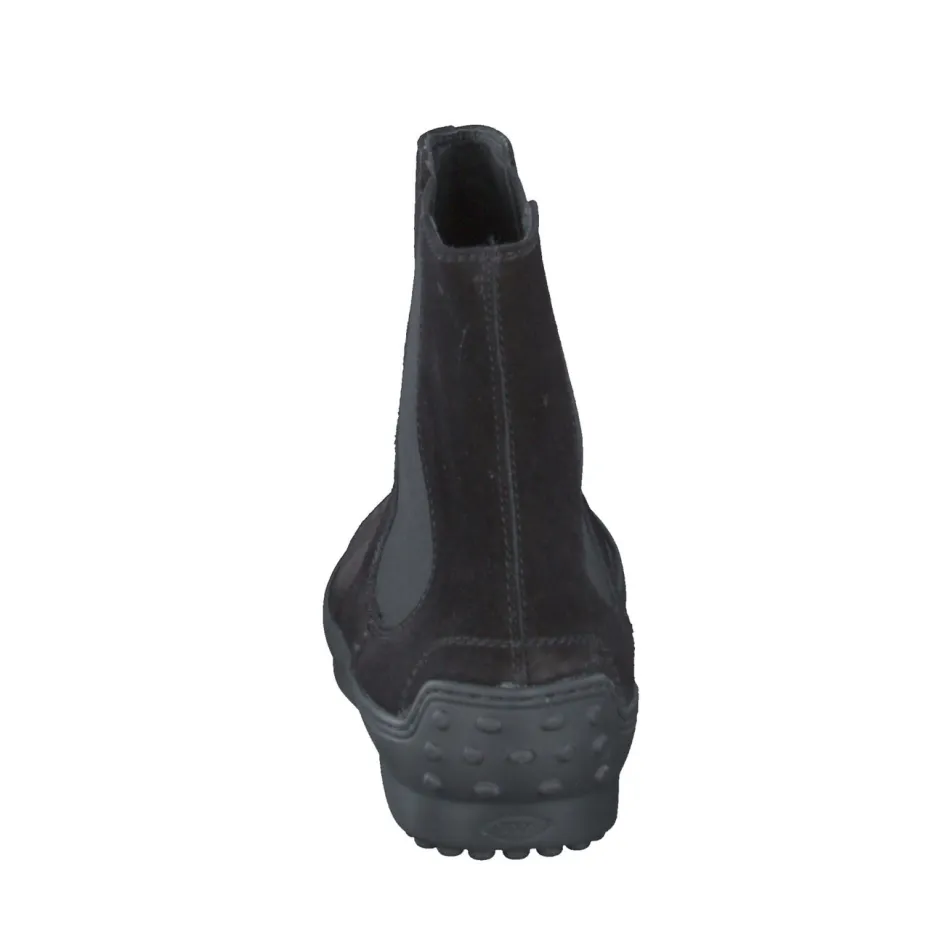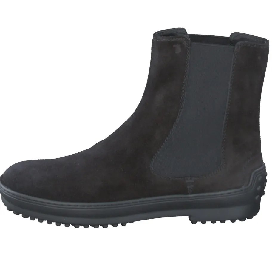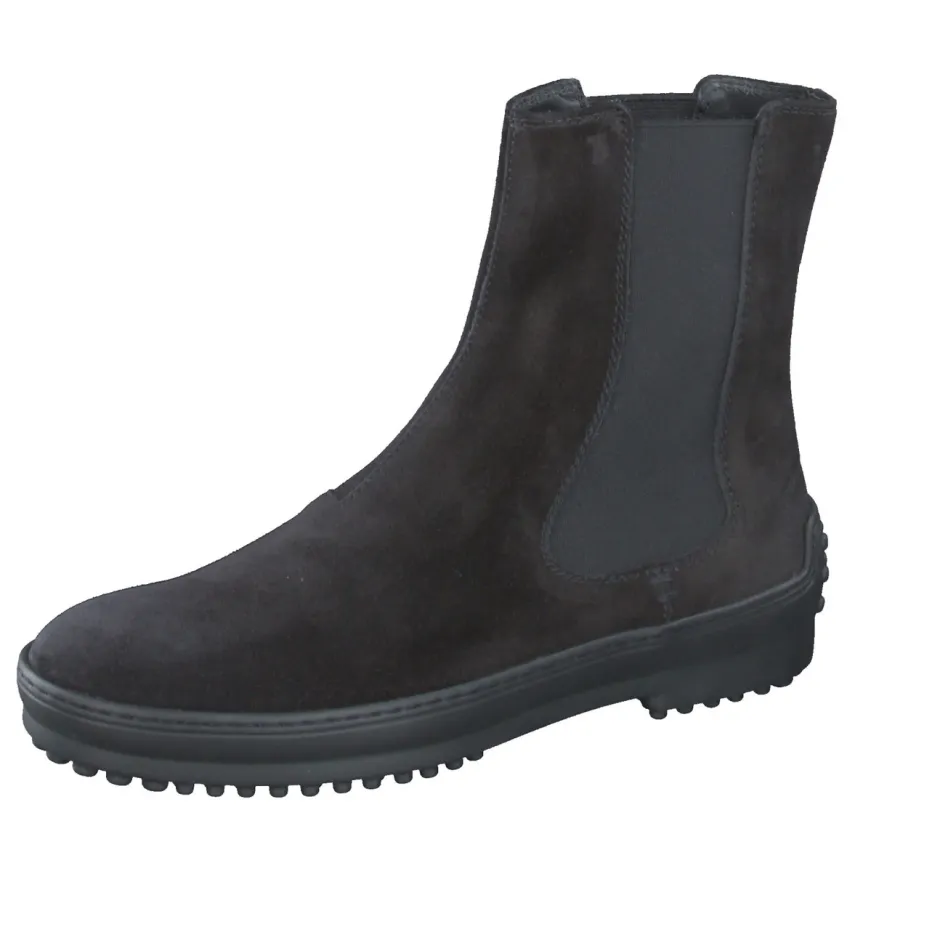 Minimalistischer Chic für citytaugliche Looks.Die Marke Tod’s zeigt bei diesen Damen-Chelsea Boots einen raffinierten Mix aus Understatement und Funktion. Für Stilbewusste, die im urbanen Alltag Wert auf Qualität und klaren Look legen: Schwarzes, samtig angeschliffenes Veloursleder verleiht dem Modell eine tiefmatte Anmutung. Seitliche Elastikeinsätze und die profilierte Gummisohle mit typischem Noppenprofil stehen für Komfort und Grip. Klassisch-knöchelhoch geschnitten, lässt sich der Boot vielseitig im Streetwear- oder Business-Kontext stylen. Ton-in-Ton-Nähte und dezentes Außenlogo betonen den ruhigen, hochwertigen Charakter. Ein Statement für reduzierte Eleganz mit ikonischem Markenbezug.