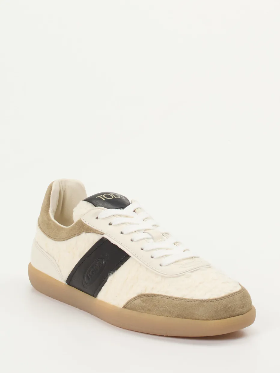 Komfort trifft auf Retro-Charme.Die Marke Tod’s präsentiert einen Low-Top-Sneaker der besonderen Art. Perfekt für entspannte Tage in urbanem Umfeld überzeugt dieses Modell durch einen anspruchsvollen Mix aus grauem Veloursleder, schwarzem Kalbleder und weißem Textil in Teddyfell-Optik. Das cremeweiße Grunddesign wird durch beigegraue und schwarze Akzente sowie kontrastierende Overlays veredelt. Schnürung und eine verstärkte Ferse mit Gumminoppen sorgen für charakteristische Funktionalität. Die klassische, flache Silhouette im Stil der Retro Court Sneaker trifft den Zeitgeist von „Quiet Luxury“. Ideal kombinierbar zu monochromen Casual-Looks mit Kaschmir oder Oversize-Hoodie. Der feine Materialkontrast und die markentypische Verarbeitungsqualität stehen für luxuriöse Lässigkeit im Alltag.