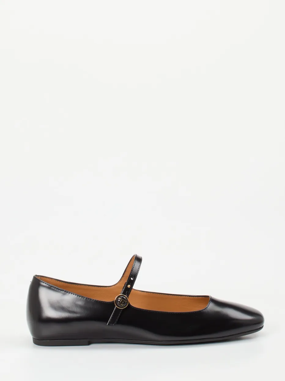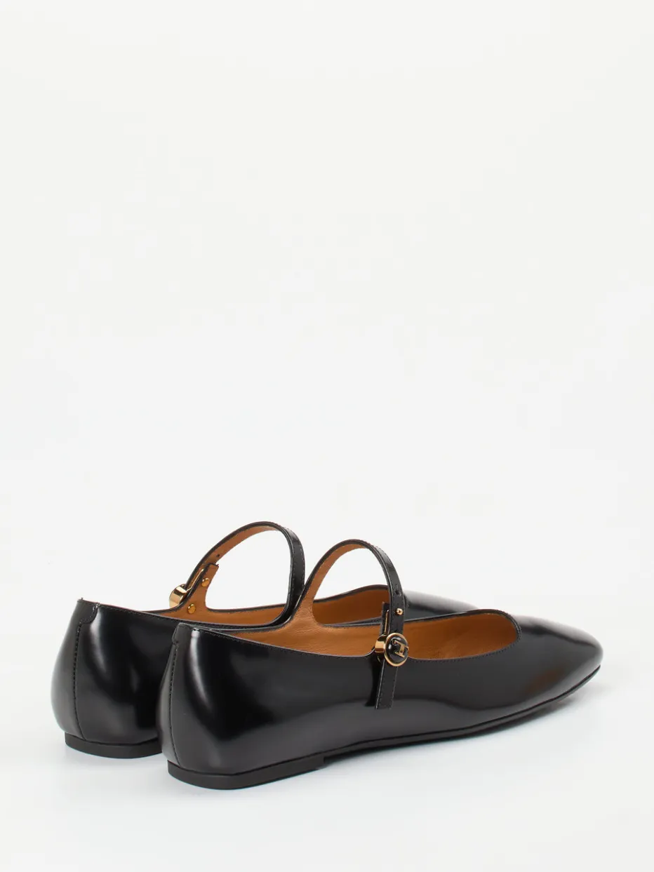 Diese Mary Jane Ballerinas von Tod’s verbinden glänzendes Hochglanzleder mit einer goldfarbenen Logo-Schnalle zu einem stilvollen Statement zeitloser Eleganz.