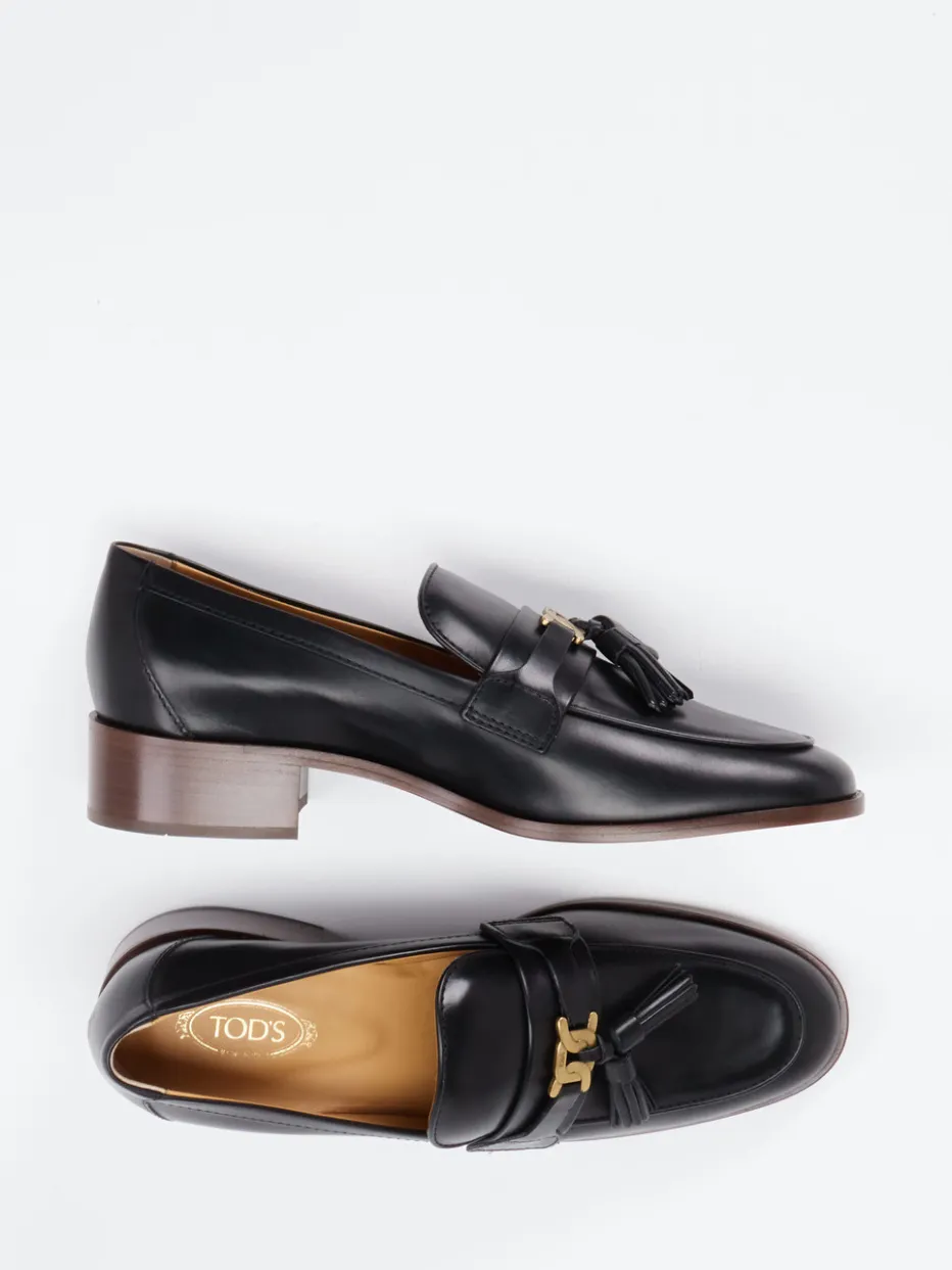 Klassik trifft auf feine Details.Tod’s interpretiert den Damen-Tassel Loafer mit klarem Anspruch an Eleganz: Dieser Halbschuh aus schwarzem, glänzendem Kalbleder überzeugt durch seine klassische Linie und präzise Verarbeitung. Ob im Berufsalltag oder beim City-Stroll – der Schlupfschuh mit tonigen Nähten, Fransenquasten und messingfarbener Zierschließe verleiht jedem Outfit Struktur und Klasse. Die leicht geschwungene Silhouette und die Ledersohle mit 3 cm hohem Blockabsatz unterstreichen die Heritage-Ästhetik, während der Innenkomfort mit Lederfutter überzeugt. Durch seinen minimalistischen Stil fügt er sich stilsicher in den „Quiet Luxury“-Trend ein und harmoniert besonders gut mit monochromen Looks oder klassischen Stoffhosen. Ein Modell mit markentypischem Feingefühl für Form, Qualität und Understatement.