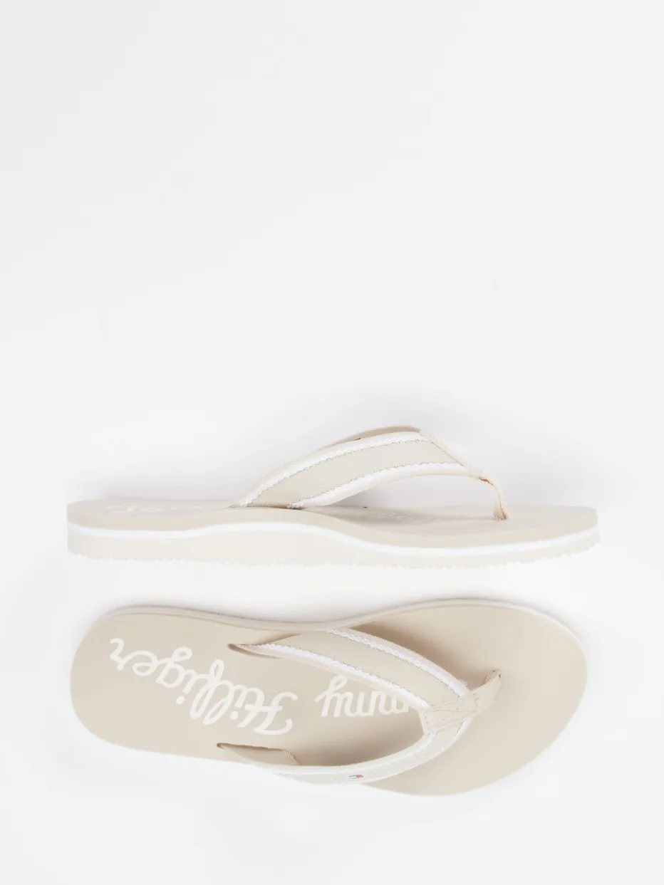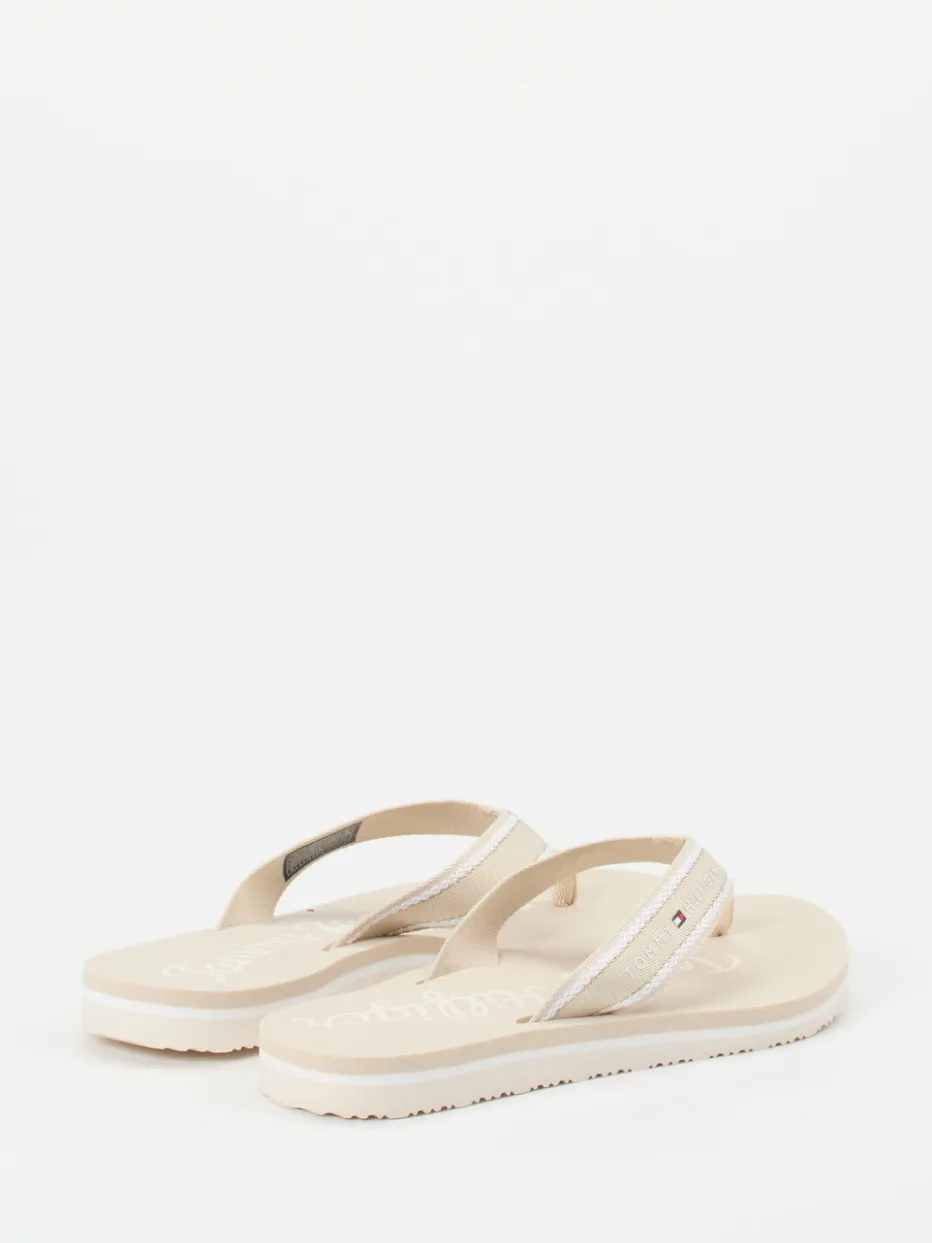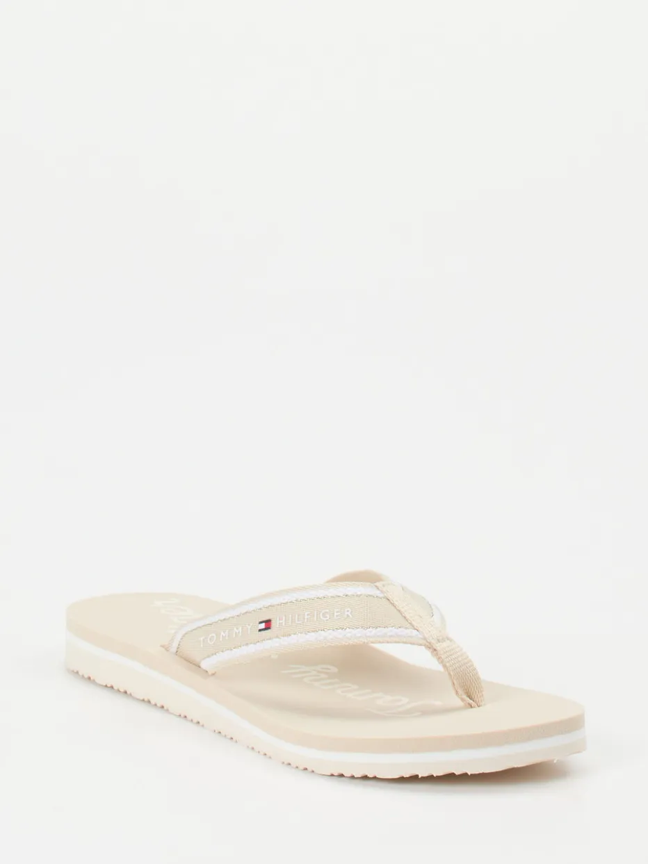 Minimalismus mit Markenflair.Tommy Hilfiger präsentiert eine Zehentrenner-Sandale aus Textil im warmen Beigeton. Ob am Pool, auf Strandpromenaden oder im heimischen Garten – die sandfarbene Schlupf-Pantolette bietet durch ihre flexible EVA-Sohle mit profilierter Struktur zuverlässigen Halt. Textilriemen mit matter Oberfläche und weiße sowie goldfarbene Zierstreifen unterstreichen das dezente Design, ergänzt durch sichtbaren Logo-Schriftzug auf Riemen und Fußbett. Die klassisch flache Form wirkt unaufdringlich und feminin. Ein angesagter Look, der sich ruhig in sommerliche Capsule Wardrobes fügt. Markenspezifische Leichtigkeit trifft auf gepflegte Zurückhaltung im Soft-Neutrals-Trend.