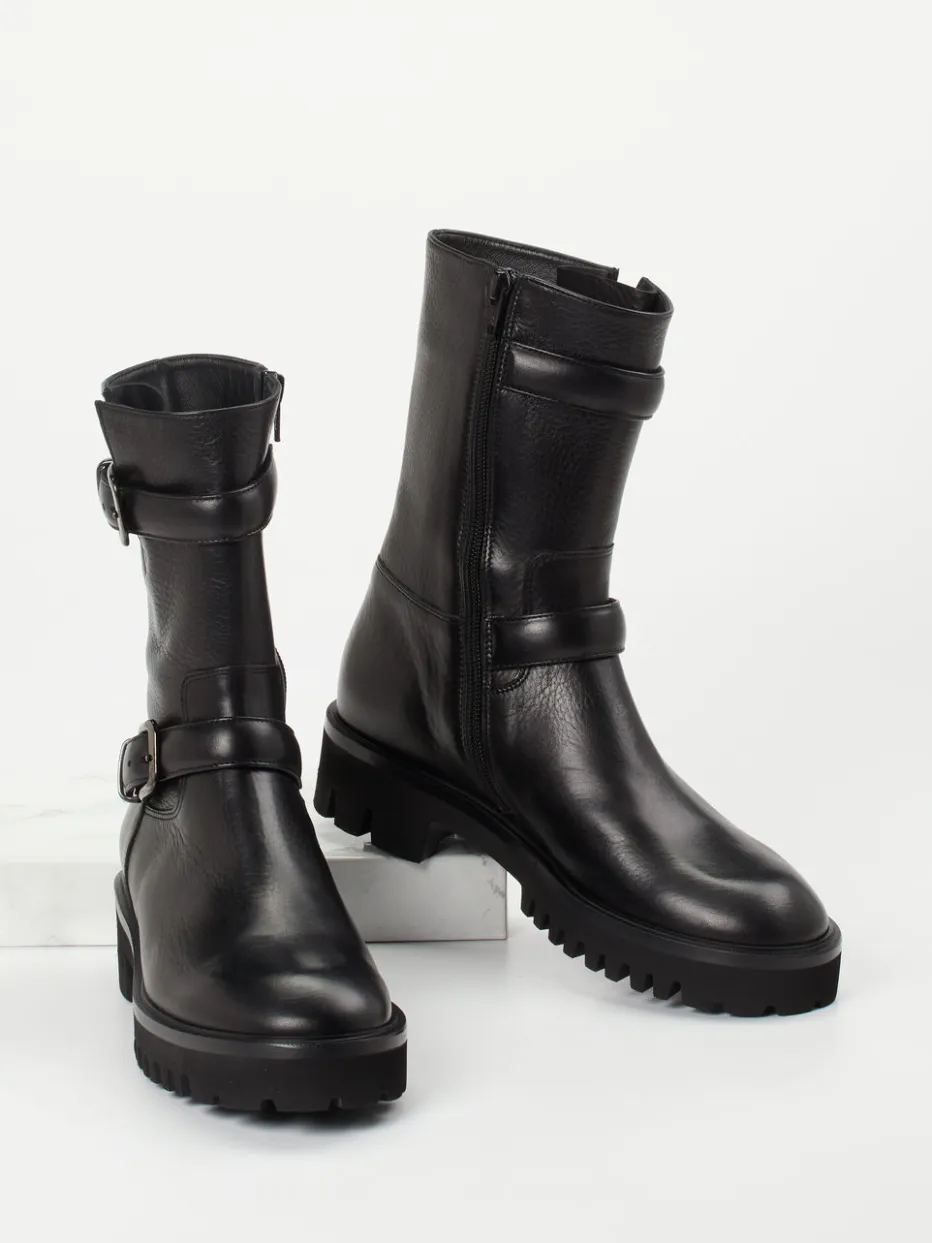 Ideal für Alltag, Stadtspaziergänge oder Wochenendtrips: Das schwarze Kalbleder zeigt sich in einer Kombination aus glatter und leicht genarbter Struktur. Gunmetal-farbene Metallschnallen setzen rockige Akzente, ergänzt durch einen praktischen Reißverschluss. Die profilierte Gummisohle mit 4 cm Absatz liefert einen cleanen Utility-Charakter und sicheren Tritt. Der mittelhohe Schaft verleiht Stabilität und wirkt trotz Chunky-Design ausgewogen. Lammnappa-Futter und gepolstertes Fußbett sorgen dabei für nachhaltigen Tragekomfort.