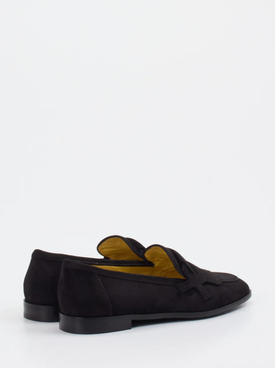 Dieser schwarze Loafer von Truman’s vereint hochwertiges Veloursleder mit einer klassischen Silhouette und dezentem Fransen-Detail – ideal für minimalistische Looks mit Anspruch.