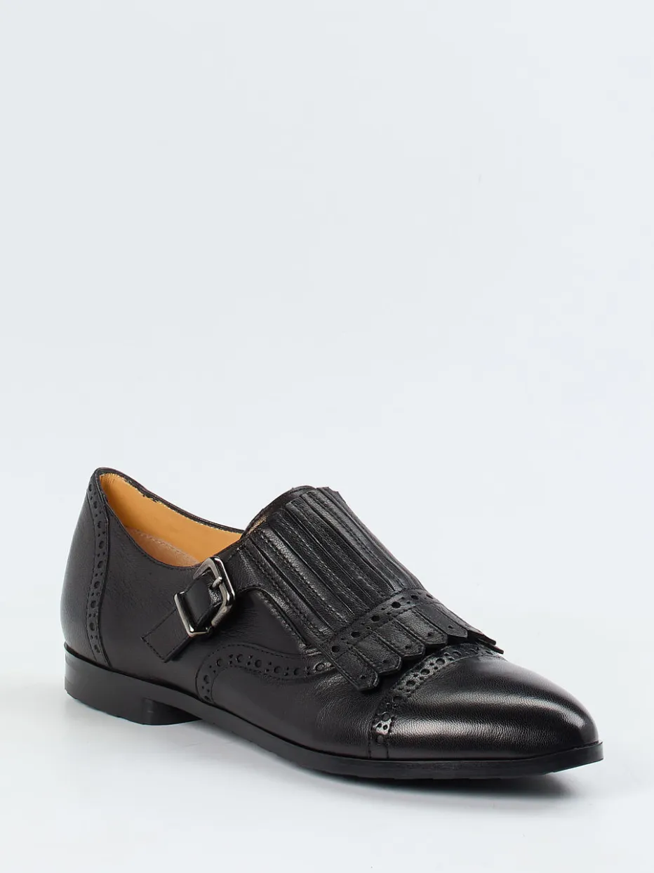 Dieser Damen-Monkstrap verbindet handwerkliche Raffinesse mit einem minimalistischen Look. Sein edles Lammleder und markante Details wie Fransenbesatz und Lyra-Lochungen sorgen für zeitlose Klasse.