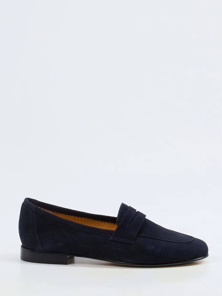Minimalismus mit Raffinesse.Truman’s interpretiert den klassischen Damenloafer in edlem dunkelblauem Veloursleder. Ob im Büroalltag oder beim Stadtbummel – dieser Penny Loafer verspricht stilsichere Auftritte. Das samtig angeschliffene Veloursleder schmiegt sich an einen leicht verrundeten Leisten, akzentuiert durch einen tonigen Penny-Riegel. Die flache Silhouette mit Blockabsatz und rutschhemmender Leder-Gummisohle bringt Komfort und Bodenhaftung. Zeitlos, reduziert und wertig – ein Paradebeispiel für den Trend „Quiet Luxury“. Kombiniert zur schmalen Stoffhose oder zum Midirock entfaltet er besonders seine Wirkung. Ein stilvoller Klassiker mit italienischer Handwerksnote.