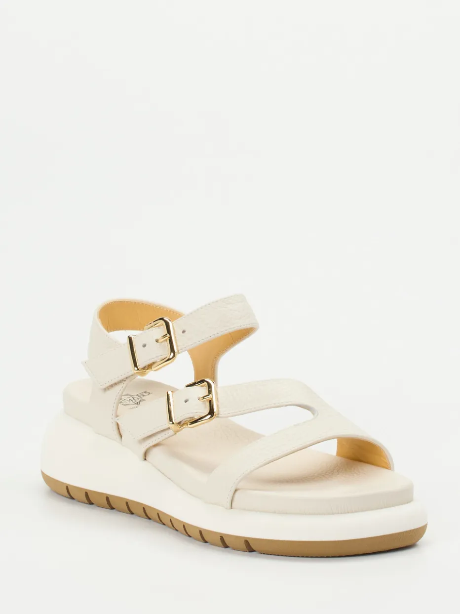 Leichtigkeit trifft auf sommerlichen Komfort.Truman’s präsentiert mit diesen Damen-Plateausandalen ein stilvolles Modell für warme Tage. Ob bei Stadtbummeln oder auf Reisen – die gepolsterte Innensohle und geschäumte Leichtzellsohle bieten langanhaltenden Tragekomfort. Das cremefarbene Hirschleder mit genarbter Struktur verleiht den vier Riemen eine luxuriös-matte Optik, ergänzt von goldfarbenen Metallschnallen und einem hochgezogenen Fersenprofil. Die profilierte, cappuccinofarbene Sohle unterstützt den aktuellen Trend zu voluminösen „Chunky Sandals“ im Sinne des „Quiet Luxury“. Minimalistisch und doch selbstbewusst – ideal zu Leinenkleidern oder Naturtönen. Ein souveräner Auftritt mit italienischer Ledertradition und stilistischer Klarheit.