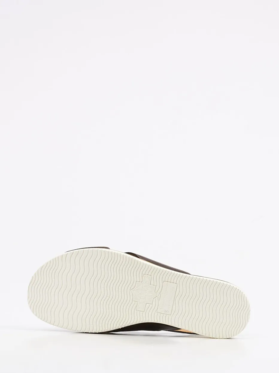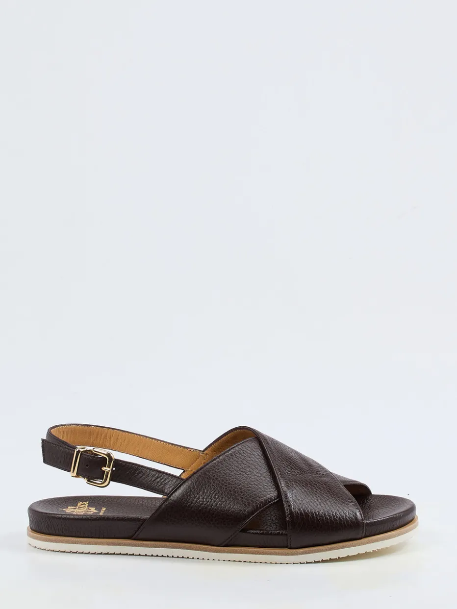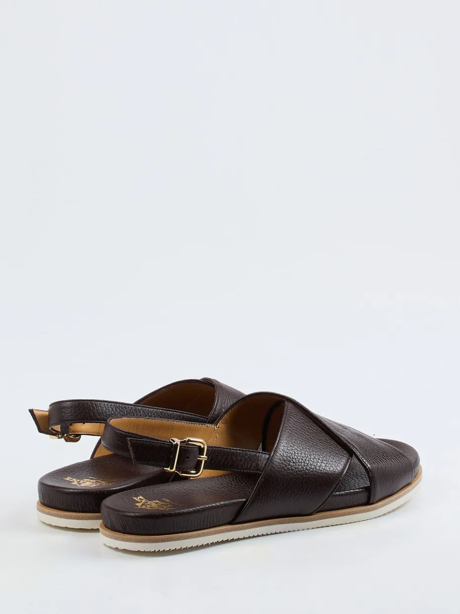Stilvoll durch warme Tage.Truman’s präsentiert mit dieser Herrensandale eine gelungene Kombination aus Komfort und Eleganz. Das Modell überzeugt im Alltag durch seine offen gearbeitete Silhouette mit gekreuzten Riemen und verstellbarem Fersenriemen. Gefertigt aus dunkelbraunem, genarbtem Hirschleder, zeigt sich die strukturierte Oberfläche besonders griffig und wertig. Die goldfarbene Schnalle und die kontrastierende Offwhite-Gummisohle setzen dezente Akzente. Ein weich gepolstertes Tieffußbett und die rutschhemmende Laufsohle steigern den Tragekomfort – auch bei längeren Wegen. Passend zu Leinenlook oder Chino einsetzbar, trifft klassisches Design auf zeitgenössische Leichtigkeit. Truman’s steht für Qualität und handwerkliche Raffinesse mit Fokus auf dezente Ästhetik.
