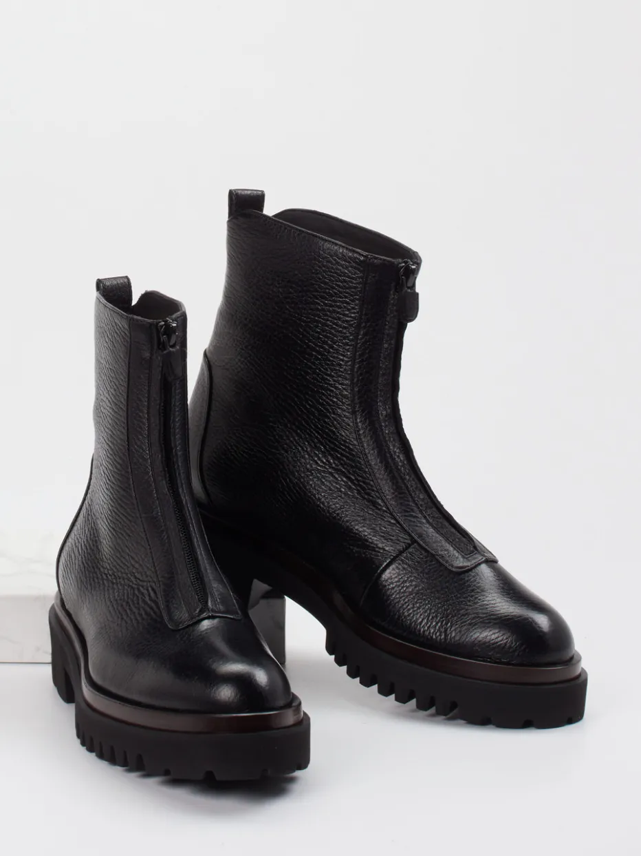 Diese Frontzip-Stiefelette aus edlem Elchleder verbindet klare Linienführung mit urbaner Funktionalität. Eine stilvolle Wahl für minimalistische Looks und den vielseitigen Alltag.