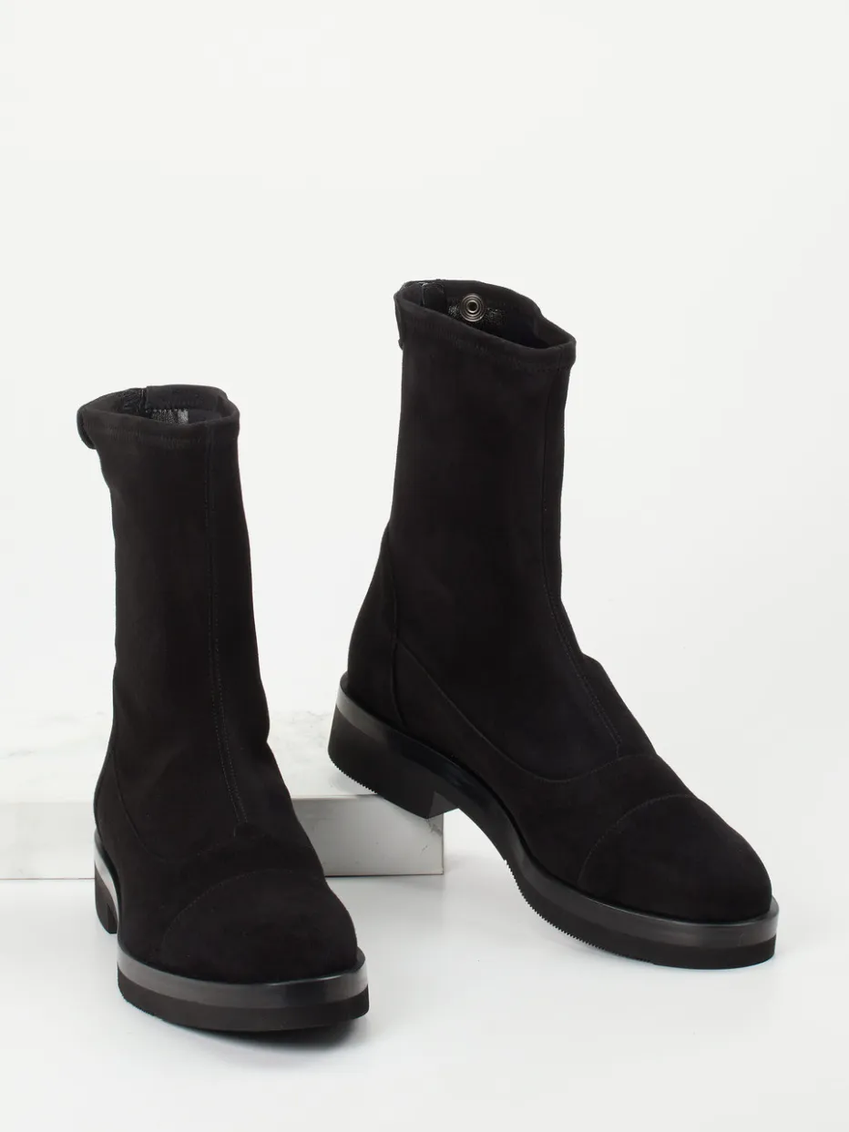 Diese schlicht designte Stiefelette überzeugt durch tiefschwarzes, samtig angeschliffenes Veloursleder und klare Silhouette. Perfekt für moderne Looks zwischen Büro und urbaner Freizeit.