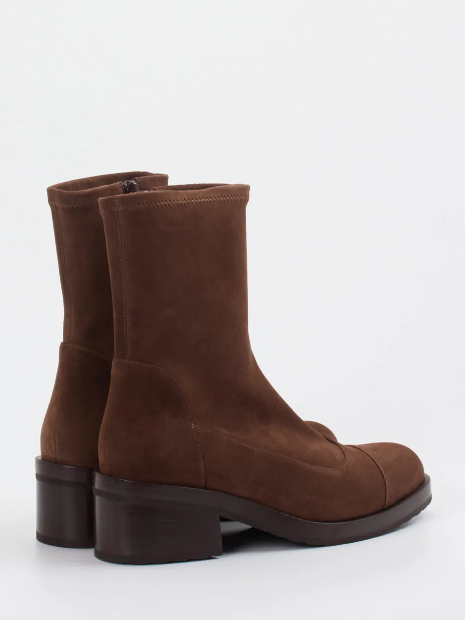 Diese Damen-Stiefelette überzeugt mit hochwertigem Veloursleder, klarer Silhouette und komfortablem Blockabsatz – ideal für stilvolle Looks mit Understatement.