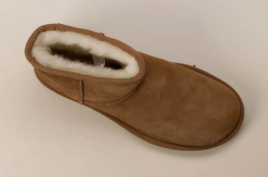 Die australische Marke UGG interpretiert klassische Damen-Stiefeletten neu. Dieses Modell überzeugt mit shortem Schaft, sichtbarem Lammfellfutter und weich verarbeitetem Veloursleder.