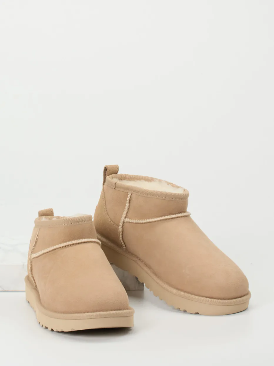 Wärme trifft skandinavische Leichtigkeit.Die Marke UGG präsentiert mit dieser Stiefelette eine moderne Version ihrer klassischen Boots. Ideal für entspannte Wintertage: Das beige Veloursleder mit samtiger Oberfläche und das sichtbare Futter aus echtem Lammfell sorgen für ein rundum wohliges Tragegefühl. Die knöchelhohe Form mit asymmetrischem Schaft, Schlupfeinstieg und markentypischer Zuglasche unterstreichen die lässige Silhouette. Dezente Ton-in-Ton-Nähte und ein Markenlogo-Patch auf der Ferse setzen feine Akzente. Perfekt für Cozy-Core-Looks und den Quiet-Luxury-Trend. Besonders stylisch in Kombination mit Strickteilen und gedeckten Naturtönen. Langlebigkeit und verlässlicher Komfort zeichnen diesen Winterfavoriten von UGG aus.