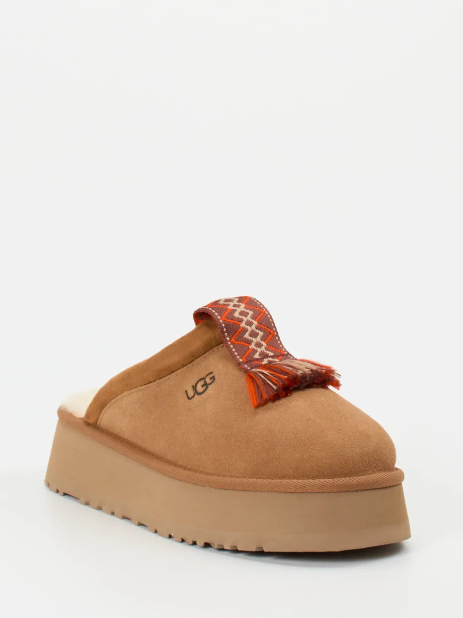 Warmer Komfort trifft entspannten Boho-Stil: Diese UGG-Mules vereinen hochwertiges Veloursleder mit weicher Wolle und stilvollen Ethno-Akzenten.