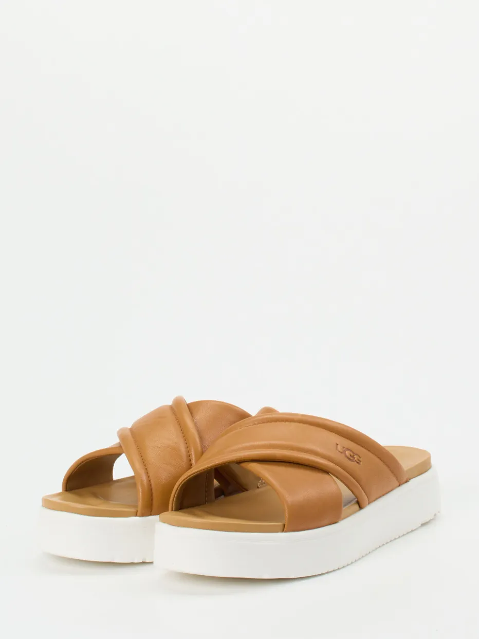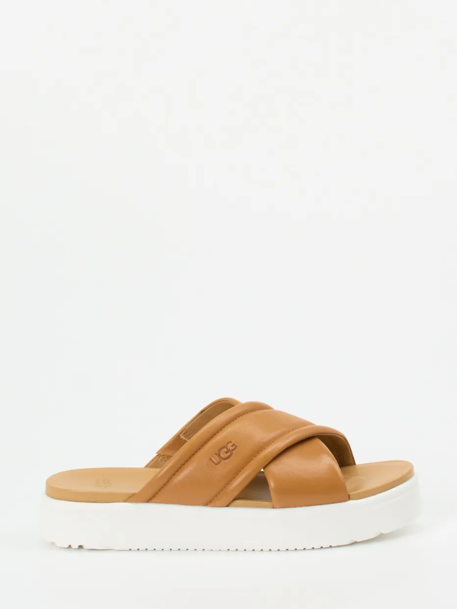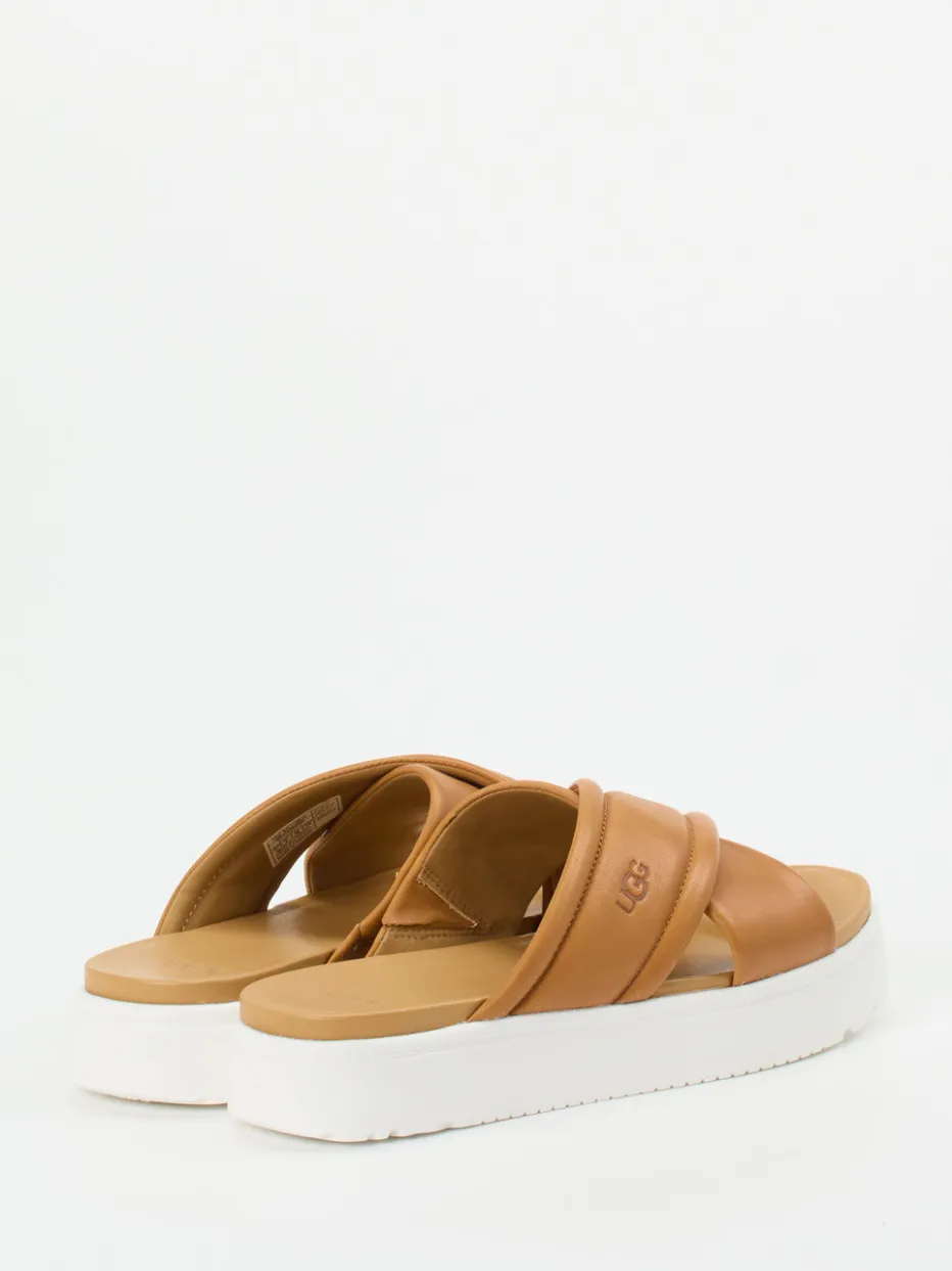 Moderner Sommerkomfort mit Statement-Sohle.UGG präsentiert modische Plateau-Slides für Damen mit hochwertigem Kalbleder und komfortorientiertem Design. Ob beim Stadtbummel oder im Urlaub, diese Pantolette erfüllt den Wunsch nach luftigem Komfort und trendiger Silhouette. Das hellbraune, glatte Kalbleder zeigt sich mit matter Oberfläche und gepolsterten, gekreuzten Riemen. Die weiße Plateausohle setzt in Optik und Funktion Akzente: angenehm dämpfend mit rutschhemmendem Profil. Minimalistische Details wie tonige Nähte und ein geprägtes Logo unterstreichen den ruhigen Stil. Ideal zu Leinenhosen oder entspannten Sommerlooks. UGG steht für Qualität und modernes Design mit besonderem Tragekomfort.
