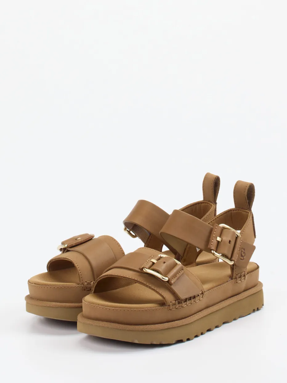 Sommerkomfort auf neuem Niveau.UGG präsentiert mit diesen Plateau-Sandalen eine stilvolle Option für urbane Sommertage. Das Modell vereint cognacbraunes Nubukleder mit samtig-matter Oberfläche, verstellbaren Riemen und goldfarbenen Schnallen. Die ergonomisch geformte Einlegesohle aus recyceltem Polyester bietet angenehmen Tragekomfort, während das robuste Profil der EVA-Zuckerrohrsohle Outdoor-Inspiration zeigt. Die offene Silhouette mit leichter Fersenlasche wirkt gleichzeitig modern und funktional. Ideal für entspannte Freizeitlooks mit Leinenhose oder Sommerkleid. UGG-typisches Design trifft auf Materialbewusstsein und Alltagstauglichkeit.