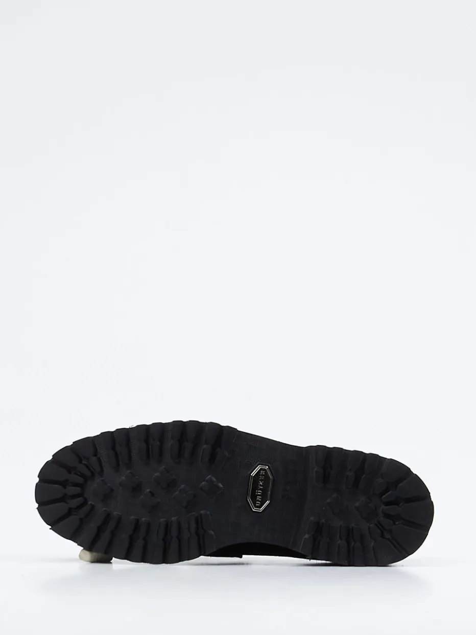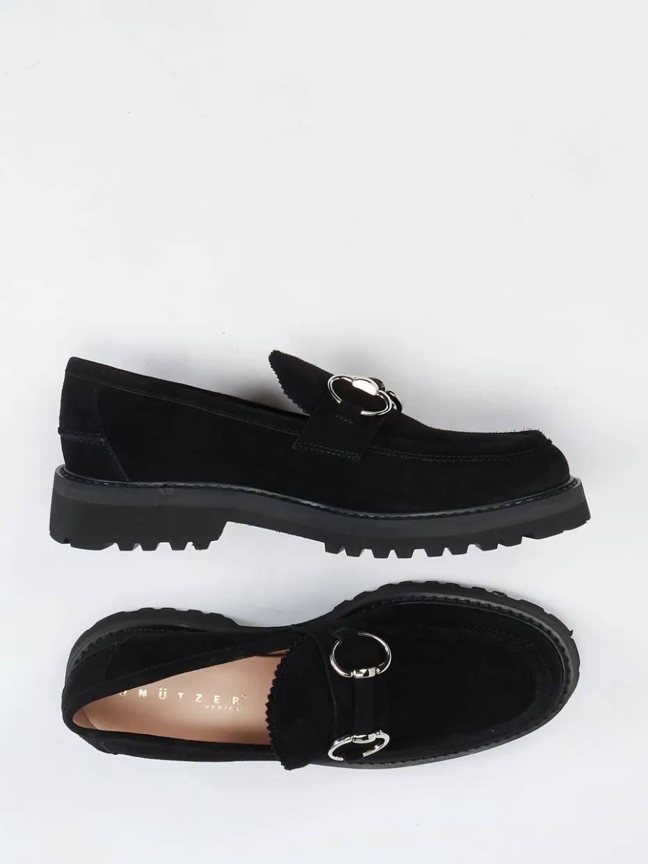 Stilstatement für moderne Klassik.Der Damen-Loafer von Unützer kombiniert italienische Handwerkskunst mit urbaner Eleganz. Ideal für Citylooks und stilvolle Business-Outfits bietet der Slipper aus schwarzem Veloursleder, samtig angeschliffen, eine weiche Haptik und eine hochwertige Anmutung. Die klassische, flache Silhouette wird durch eine ausgeprägt profilierte Leichtzellsohle akzentuiert, die sowohl optisch als auch funktional überzeugt. Eine silberfarbene Zierspange sowie ein gezackter Schaftabschluss sorgen für dezenten Glamour im „Quiet Luxury“-Stil. Die Mokassinnaht unterstreicht die heritage-inspirierte Formsprache dieses Trendstücks für Herbst/Winter. Unützer verbindet zeitgemäßen Komfort mit luxuriös reduzierter Ästhetik.