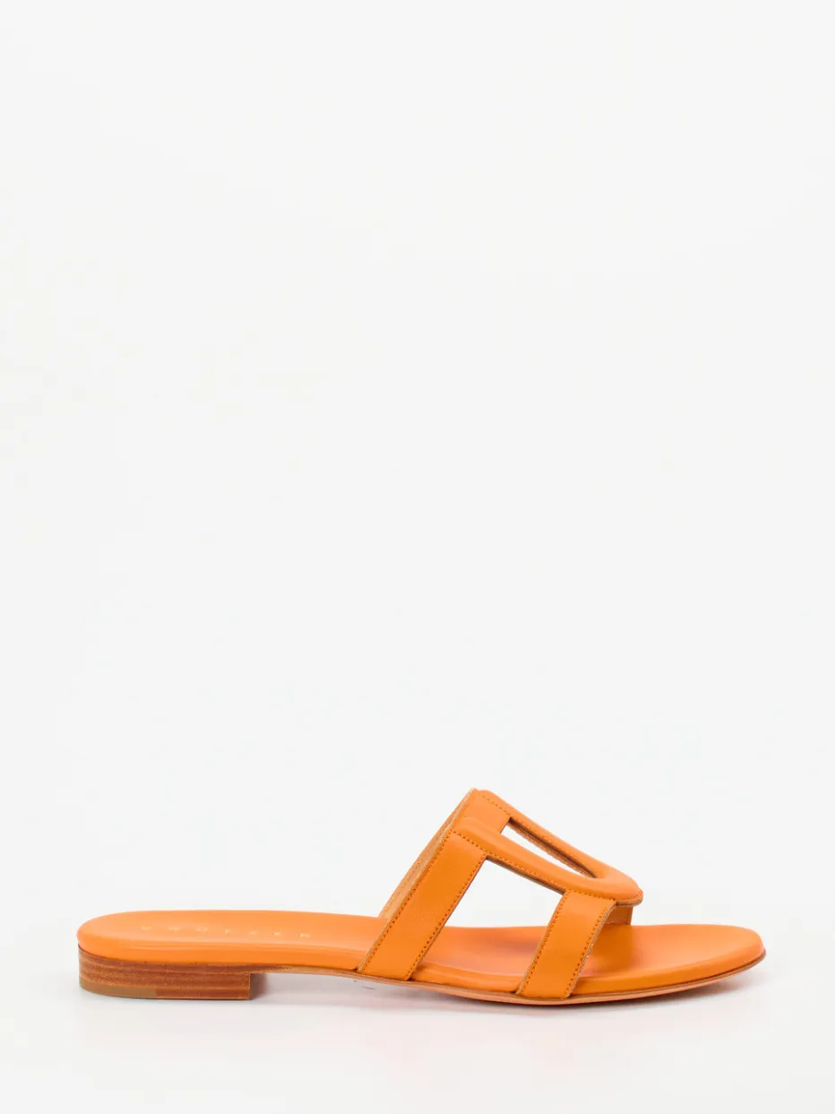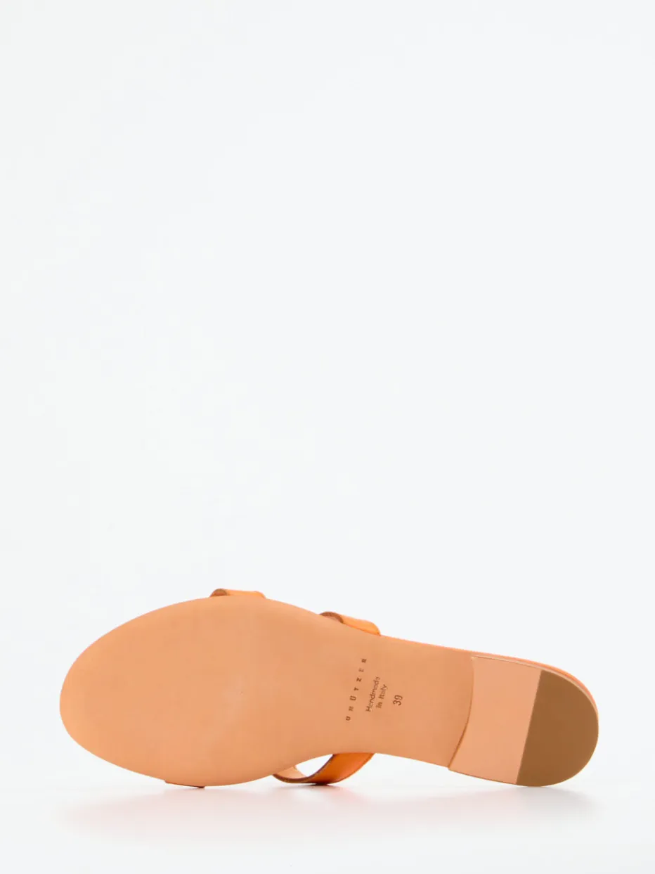 Design trifft sommerliche Nonchalance.Unützer präsentiert eine moderne Damen-Slide, ideal für entspannte Sommertage. Die aus hochwertigem Kalbleder gefertigte Pantolette zeigt sich in einem intensiven Orangeton mit matter Oberfläche und Ton-in-Ton-Nähten. Die gepolsterten Riemen bilden eine klare, symmetrische Silhouette mit offener Zehenpartie, ganz ohne Verschluss. Eine flache Sohle aus Leder mit einem dezenten Absatz in Holzoptik unterstreicht das dezente Design. Inspiriert vom mediterranen Chic und dem Trend „Quiet Luxury“, ist dieses Modell gleichzeitig komfortabel und stilistisch wegweisend. Besonders stimmig zu Naturfasern wie Leinen kombinierbar. Zeitloser Komfort mit italienischem Designanspruch.