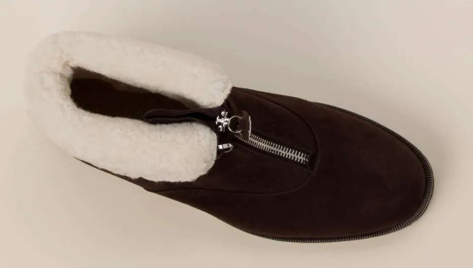 Stilvolles Winter-Statement in alpinem Look.Die Marke Unützer präsentiert eine elegante Damen-Stiefelette aus hochwertigem Veloursleder. Für kalte Tage konzipiert, überzeugt das Modell durch wärmendes Lammfellfutter und eine griffige Vibram-Profilsohle. Das dunkelbraune Leder zeigt eine matte, samtige Textur und harmoniert mit den silberfarbenen Akzenten wie Reißverschluss und Zierschnalle. Der klassische, leicht aufklappbare Schaft ermöglicht individuelle Stylings – von lässig bis feminin. Inspiriert vom Alpin-Stil und verankert im Trend „Shearling Revival“ bietet die Stiefelette Komfort mit Understatement-Luxus. Unützer steht hier für feinstes Schuhhandwerk mit alltagstauglichem Winterkomfort.