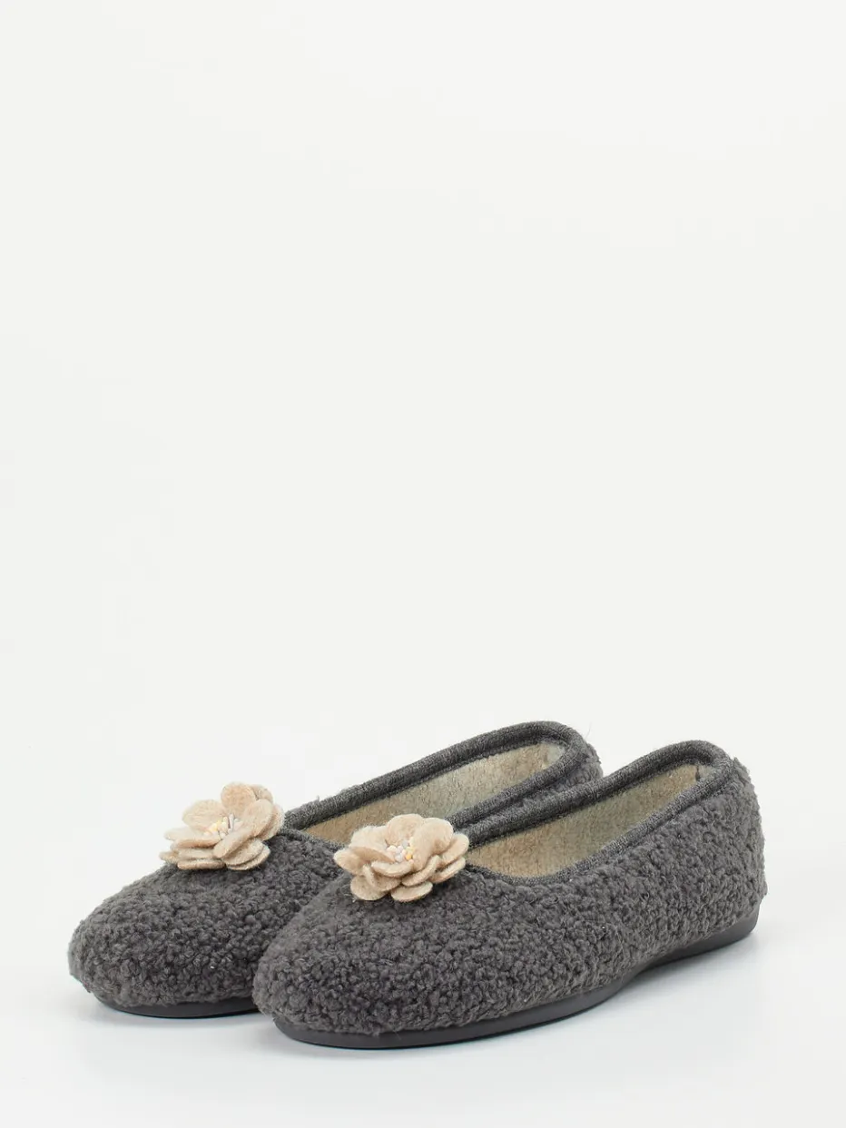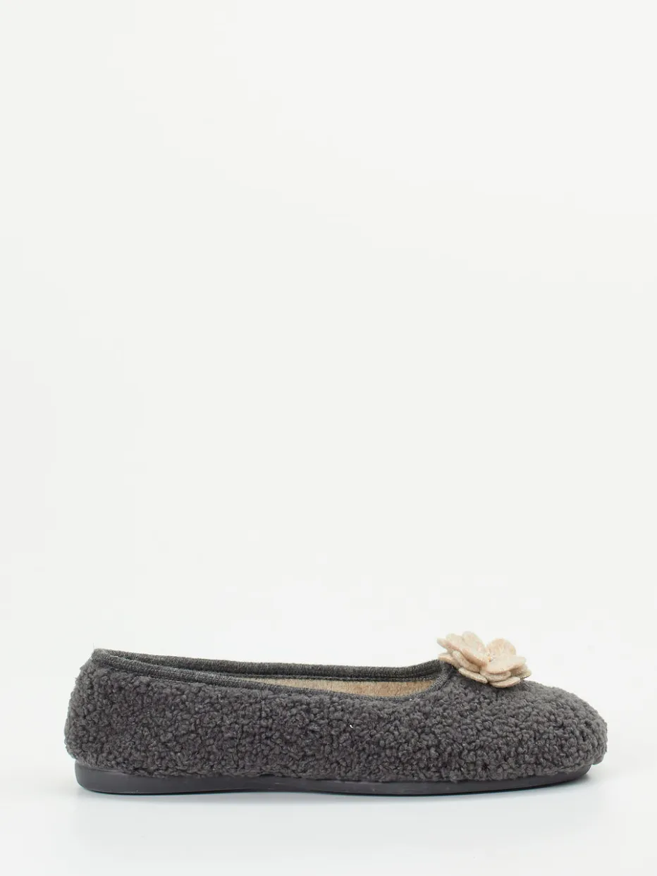 Gemütlich wohnen mit Stil.Die Marke Varomed präsentiert einen Damen-Ballerina-Hausschuh mit wohnlichem Charakter. Ideal für entspannte Stunden auf dem heimischen Sofa: Das weiche Textil-Obermaterial in Filzoptik schmiegt sich sanft an und zeigt sich in elegantem Anthrazitgrau. Die klassisch runde Form, kombiniert mit einem elastischen Einstieg, bietet hohen Komfort und erleichtert das Anziehen. Eine dekorative Filzblume mit dezentem Perlendetail unterstreicht die feminine Gestaltung. Die rutschhemmende Gummisohle sorgt für Sicherheit auf glatten Böden und rundet die Funktionalität ab. Das Modell passt gut zu Fleece-Hausanzügen oder kuscheligen Strickteilen. Komfortabel, durchdacht und mit Sinn für wohnliche Ästhetik designed.