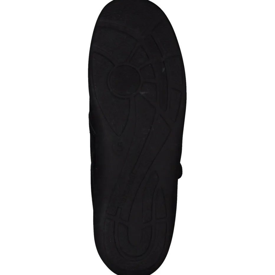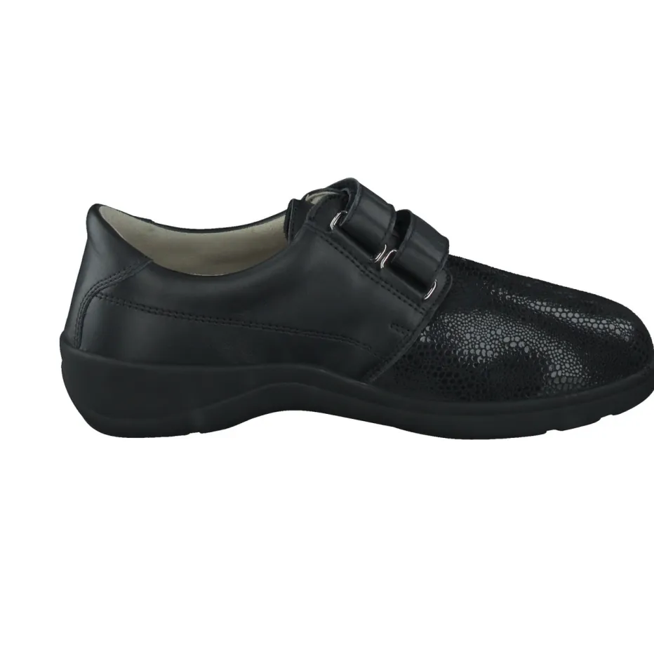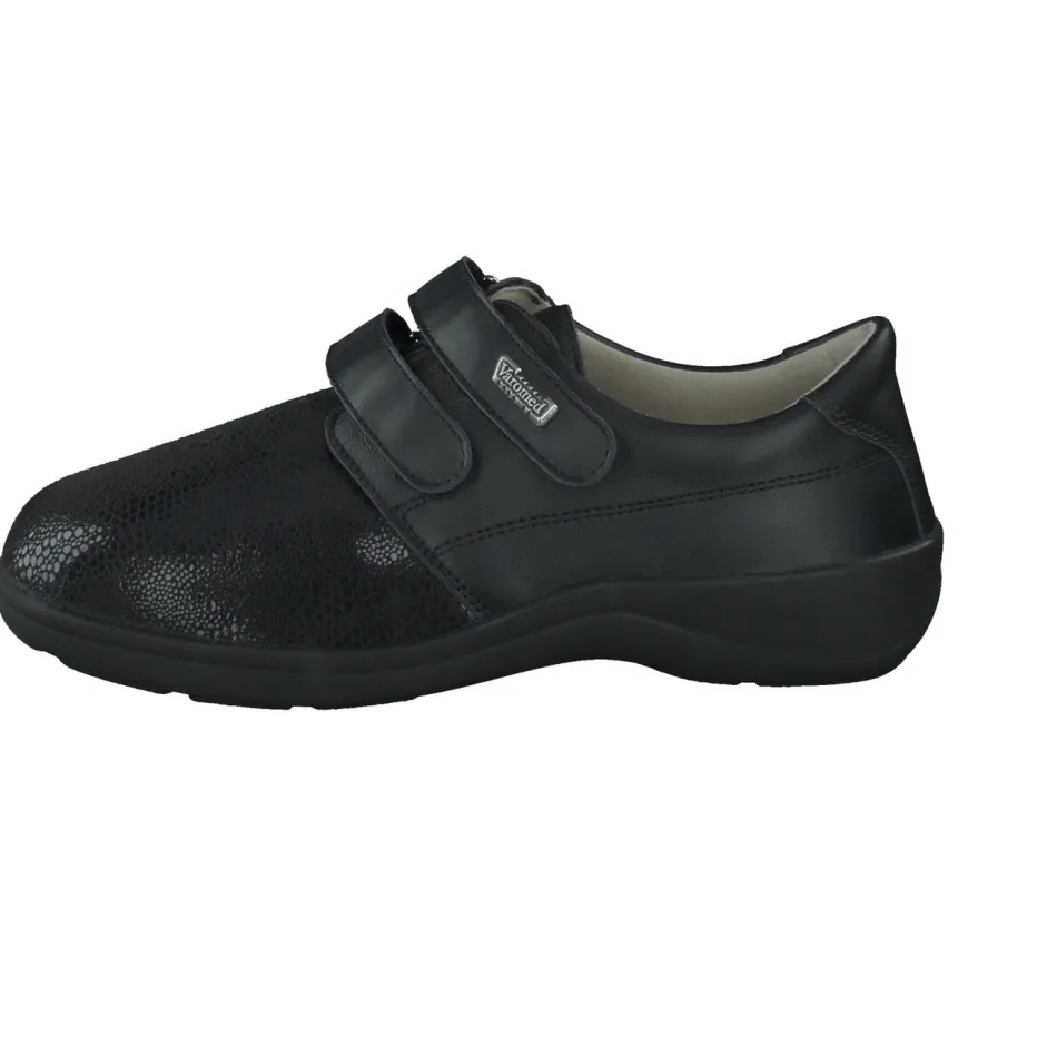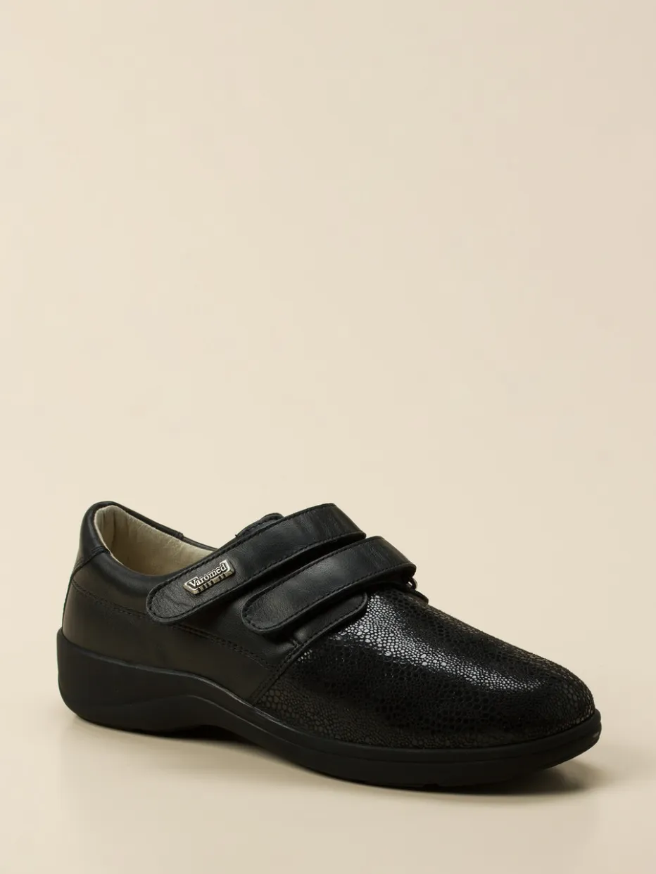 Durchdacht für mehr Komfort.Varomed präsentiert einen Damen-Bequemschuh mit ergonomischer Form und funktionalem Design. Ob auf dem Heimweg oder beim Erledigen täglicher Wege – dieser Halbschuh vereint Komfort und Alltagstauglichkeit. Das Kalbleder überzeugt durch partiellen Glanz und eingeprägte Reptilstruktur, kombiniert mit dehnbarem Stretchmaterial, das Druckstellen reduziert. Die schwarze Farbe wirkt unaufdringlich-elegant, während zwei Klettverschlüsse individuelles Anpassen ermöglichen. Die metallische Logo-Applikation, ein gepolsterter Schaft und die rutschhemmende PU-Sohle runden die funktionale Gestaltung ab. Modisch orientiert sich das Modell an aktuellen „Functional Footwear“-Trends. Besonders geeignet für empfindliche Füße – mit Varomed-Komfortanspruch.