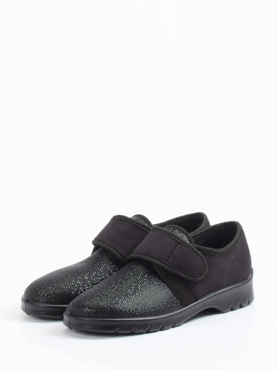 Ein komfortorientierter Damen-Hausschuh mit ergonomisch weichem Einstieg, strapazierfähiger Gummisohle und pflegeleichter Oberfläche – ideal für entspannte Alltagsmomente.