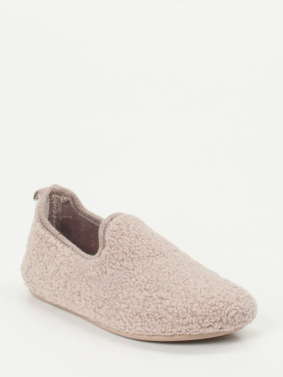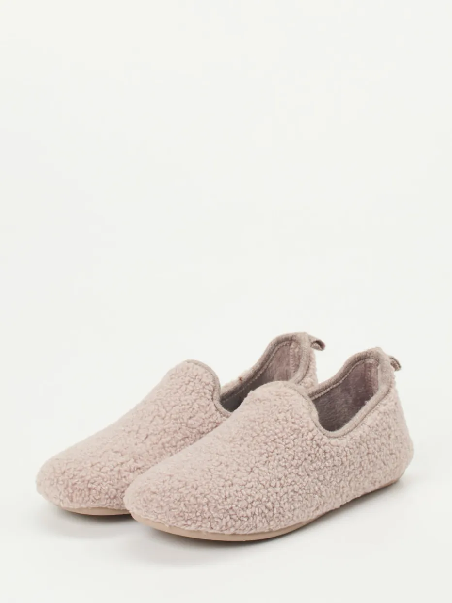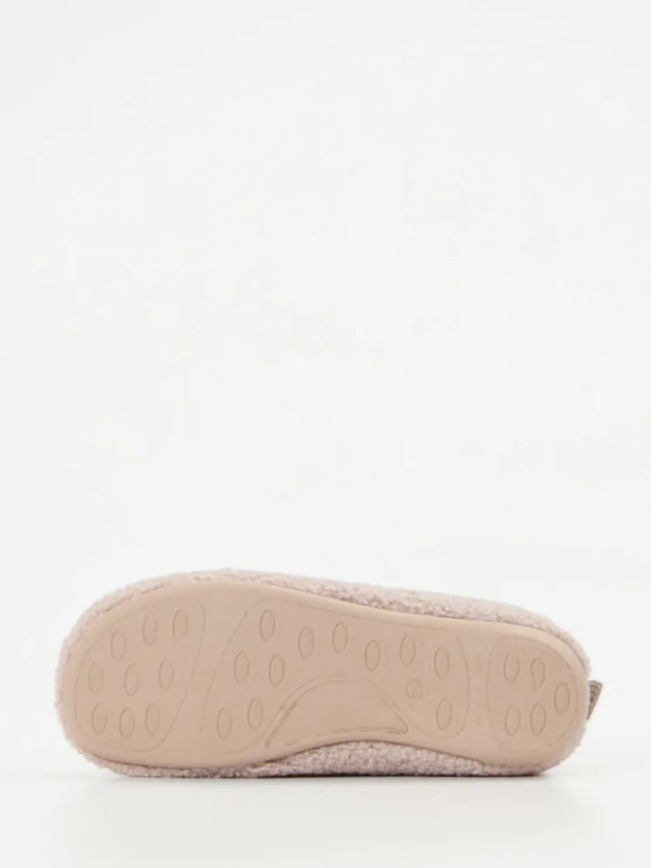 Wenn der Alltag draußen bleibt, sorgt dieser Hausschuh für behagliche Geborgenheit. Das Textilmaterial aus samtig-weichem Teddyfleece umhüllt den Fuß und bietet dank elastischem Einstieg ein komfortables Tragegefühl. In zartem Altrosa strahlt der Schuh wohnliche Wärme aus, stilvoll ergänzt durch Ton-in-Ton Einfassungen und eine dezente Fersenschlaufe. Die rutschhemmende Gummisohle bietet sicheren Stand auf glatten Böden. Inspiriert vom Loungewear-Trend passt er perfekt zu einem kuscheligen Hausanzug.