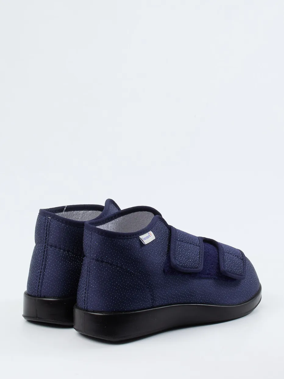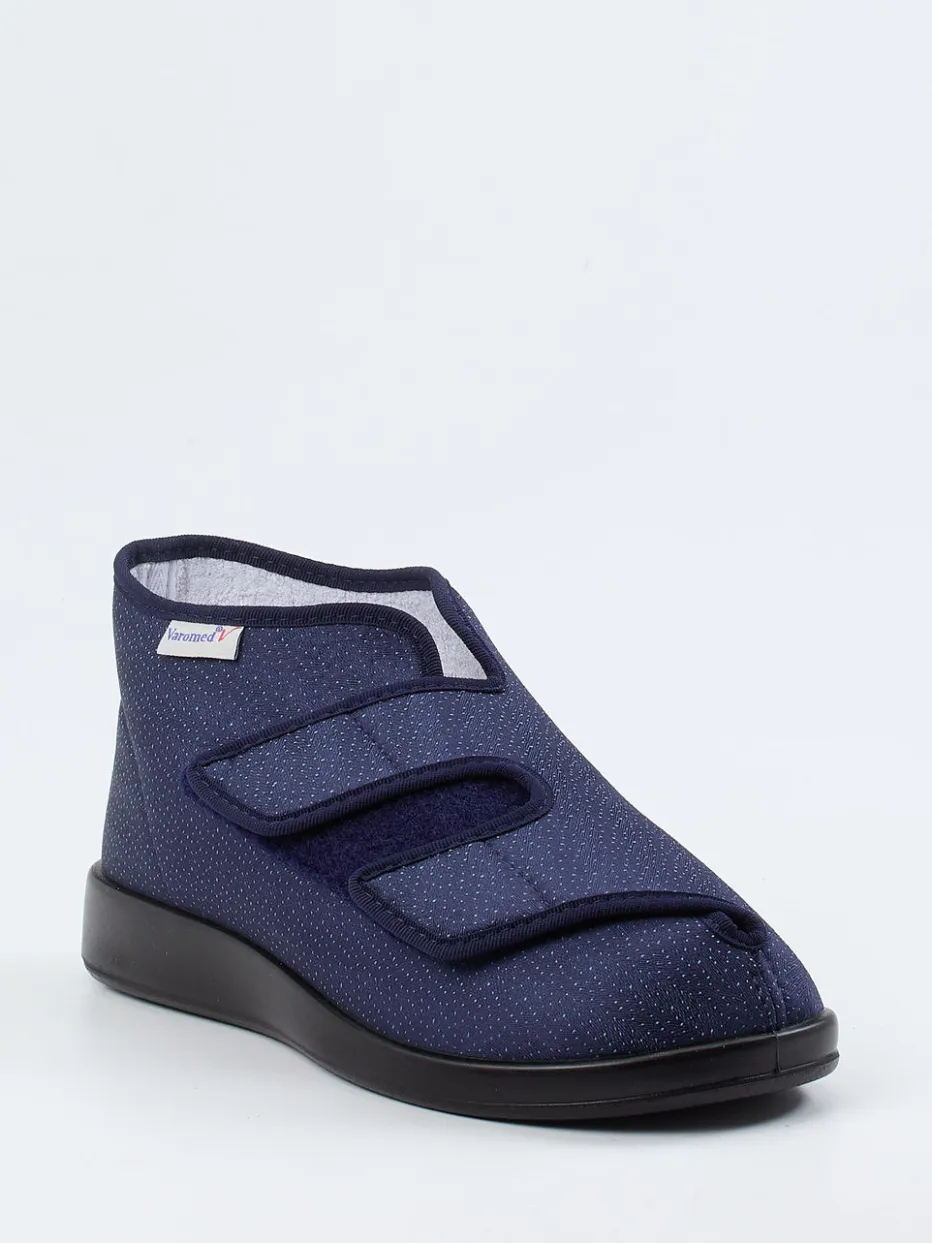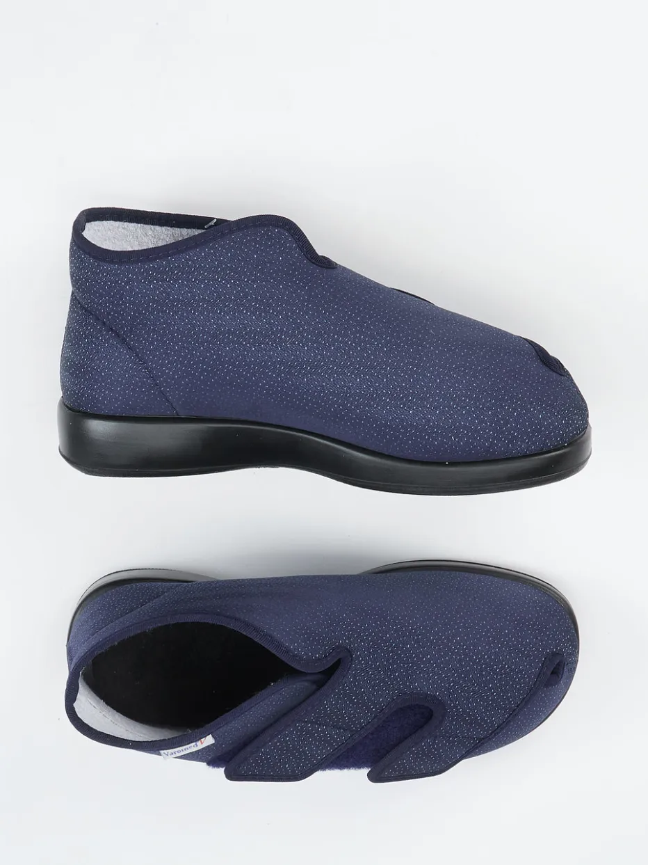 Ruhiger Komfort für sensible Füße.Varomed präsentiert mit diesem halbhohen Hausschuh einen funktional konzentrierten Therapieschuh. Ideal für entspannte Stunden zu Hause oder im täglichen Einsatz bei gesundheitsorientiertem Bedarf: Das elastische Textilmaterial ist samtig matt, zeigt sich in Dunkelblau mit mikropunktierter Struktur und liegt weich am Fuß. Zwei breite Klettverschlüsse ermöglichen einen mühelosen Einstieg – auch bei geschwollenen Füßen. Die ergonomische PU-Sohle bietet Halt, während Frottee-Innenfutter und Wechselfußbett für angenehme Dämpfung sorgen. Optisch reduziert, trifft der Look den Trend „Quiet Comfort“. Ein pflegeleichter Komfortschuh mit funktionalem Anspruch und Varomed-typischer Alltagstauglichkeit.