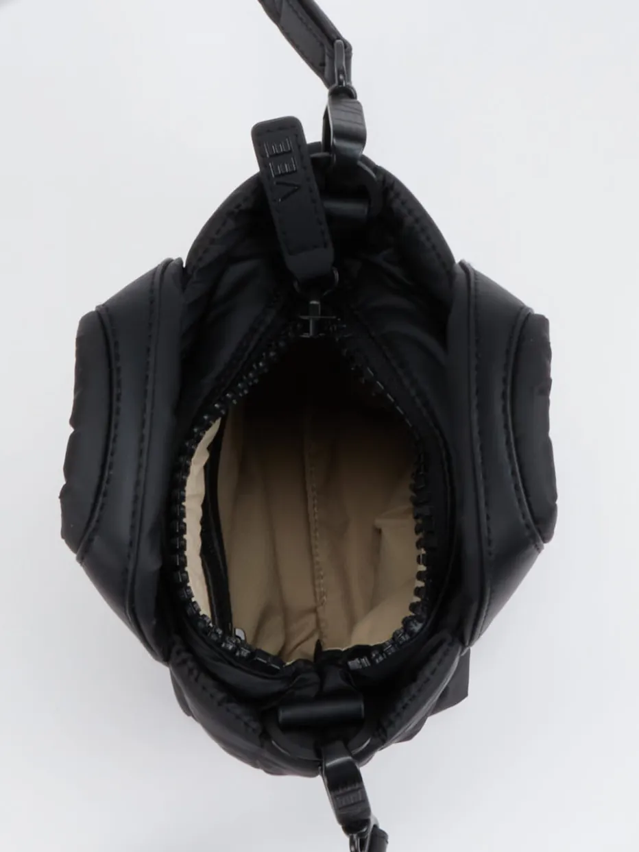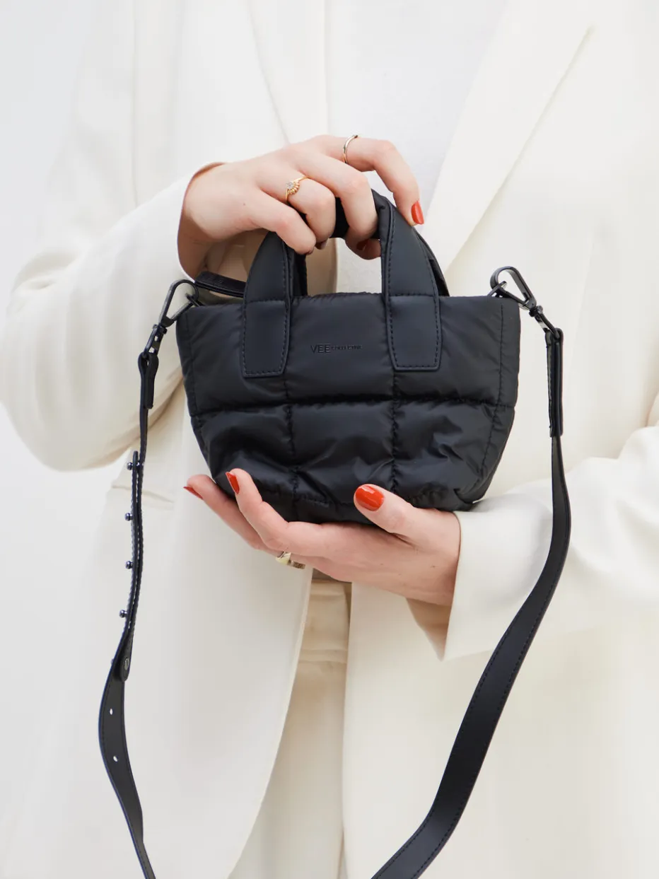 Diese gepolsterte Mini Tote Bag von VeeCollective Berlin kombiniert ultraleichtes Nylon mit urbaner Funktionalität – ideal für minimalistische Alltags-Looks.