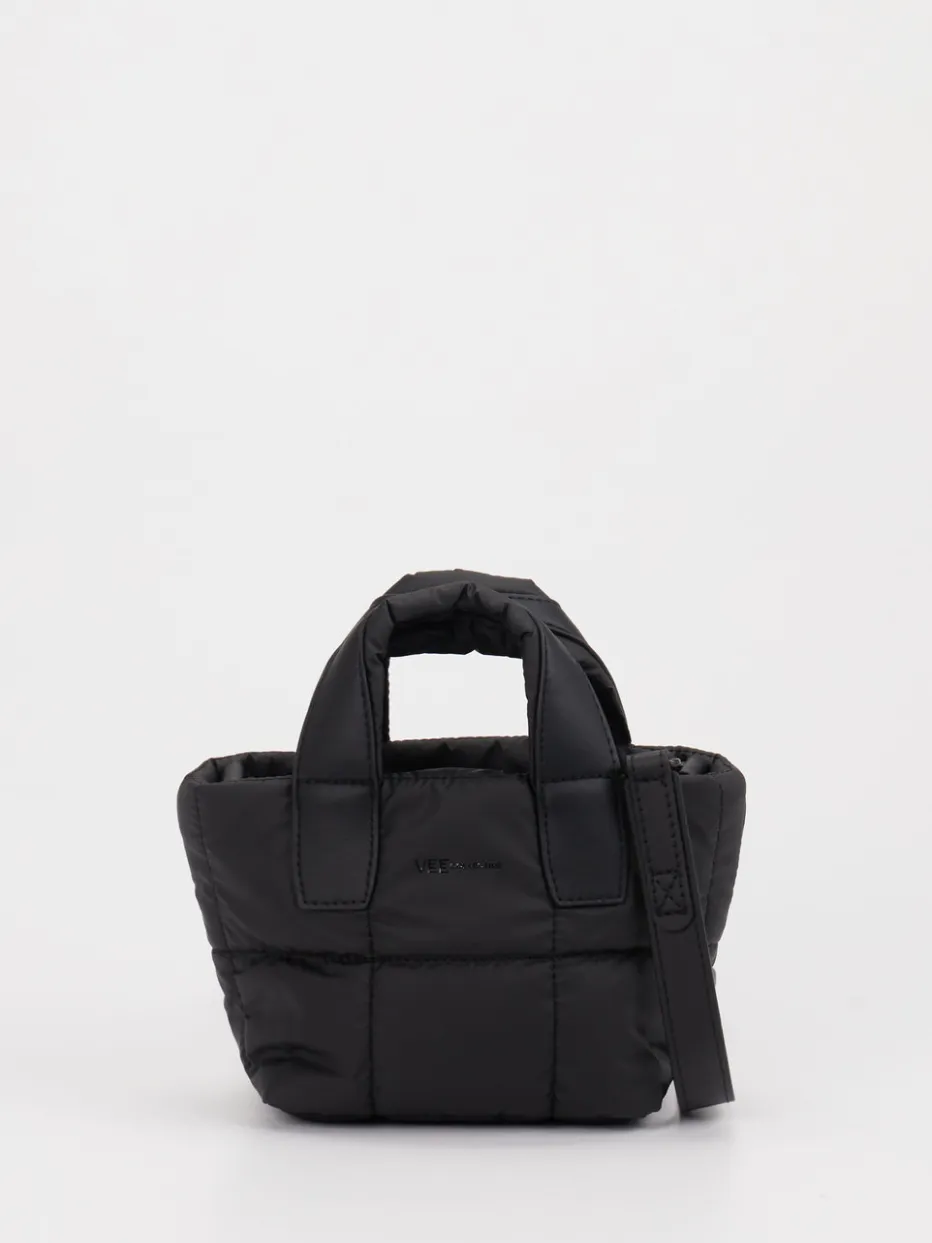 Leicht gepolstert. Maximales Stilgefühl. Vor allem aber: vegan. VeeCollective Berlin präsentiert mit dieser Mini Tote Bag eine ultra-leichte Damen-Handtasche für entspannte Alltagsmomente. Aus mattem, wasserabweisendem Nylon gefertigt, zeigt sie sich in klassischem Schwarz mit trapezförmiger Silhouette und tonaler Steppung. Zwei Trageoptionen – Tragehenkel oder verstellbarer Schulterriemen – sorgen für urbanen Komfort. Schwarze Hardware und dezente Logo-Prägung unterstreichen den minimalistischen Streetwear-Look. Die kompakte Form eignet sich ideal für City-Ausflüge oder Casual Styles. Besonders im Trend liegt sie durch Puffy-Bag-Ästhetik und Quiet-Luxury-Anmutung. Ein durchdachtes Design, das Leichtigkeit und Funktion mit markentypischer Stilreduktion vereint.