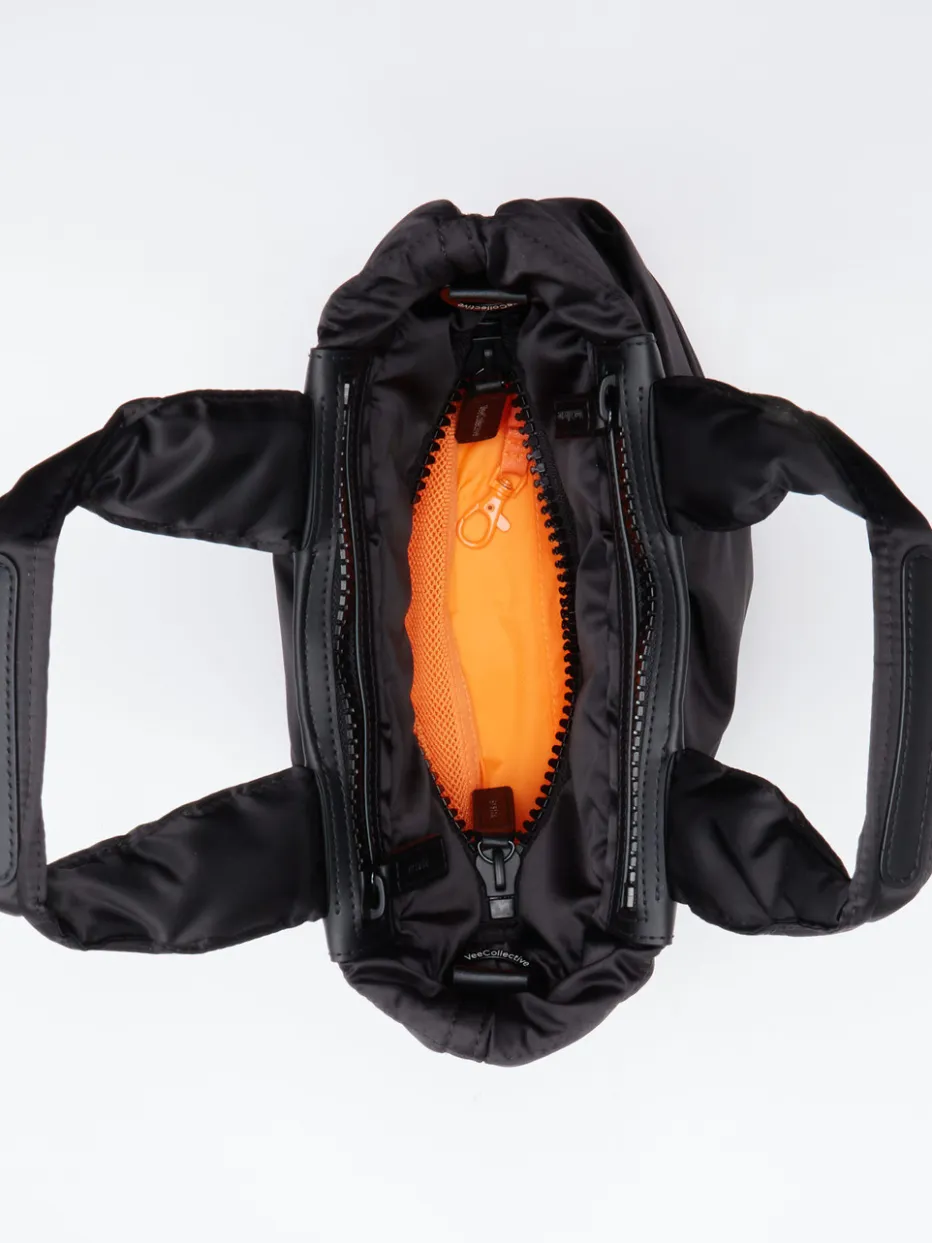 Diese schwarze Umhängetasche der Marke VeeCollective Berlin verkörpert die Modernität des jungen Labels. Das Obermaterial aus wasserabweisendem, recyceltem Ripstop-Nylon zeichnet sich durch seine unnachahmliche Leichtigkeit und Robustheit aus. Der mit veganem Kunstleder bezogene Henkel kann mit einem beiliegenden Schulterriemen ergänzt werden. Ihre wichtigsten Habseligkeiten wie Handy und Portemonnaie lassen sich in den Fächern des orangefarbenen Innenraumes gut verstauen. Die Tasche ist mit einem sportlichen Zipper verschließbar. – Obermaterial: Ripstop Nylon – Futter: Textil – Farbe: Schwarz – Größe: ca. 20 x 30 x 12 cm (H x B x T) – Henkel: ca. 30 cm – Schulterriemen: max. ca. 110 cm, abnehm-und verstellbar – Verschluss: Reißverschluss – Innen: ein Steckfach, ein Reißverschlussfach – Extra: eine herausnehmbare, faltbare Innentasche 17 x 25 X 2 cm (H x B x T) – Außen: zwei weitere Reißverschlussfächer