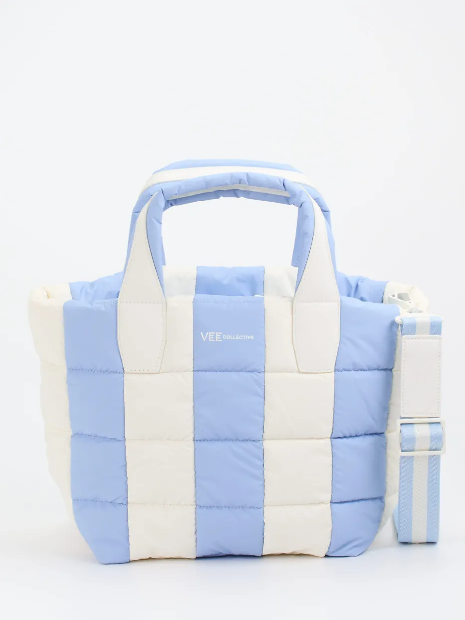 Diese modische Umhängetasche des Berliner Labels Vee Collective überzeugt mit ihren vielen wünschenswerten Eigenschaften: Das zu 100% recycelte Nylon ist strapazierfähig, angenehm leicht, schmutz- und wasserabweisend. Das blauweiße Streifenmuster wirkt zusammen mit den weißen, veganen Kunstlederelementen zugleich frisch und zeitlos. Im Innenraum können Sie Ihre Utensilien dank verschiedener Fächer geordnet und strukturiert verstauen. Mit dieser nachhaltigen Tasche erwerben Sie ein langlebiges Produkt von hoher Qualität. – Obermaterial: Ripstop Nylon – Futter: Textil – Farbe: Blau/ Weiß – Größe: ca. 25 x 40 x 20 cm (H x B x T) – Schulterriemen: max. ca. 125 cm, verstell- und abnehmbar – Verschluss: Reißverschluss – Innen: ein Reißverschlussfach, zwei Netzfächer, ein Druckknopffach – Außen: zwei zusätzliche Reißverschlussfächer – Extras: herausnehmbare Innentasche (ca. 20 x 20 cm)