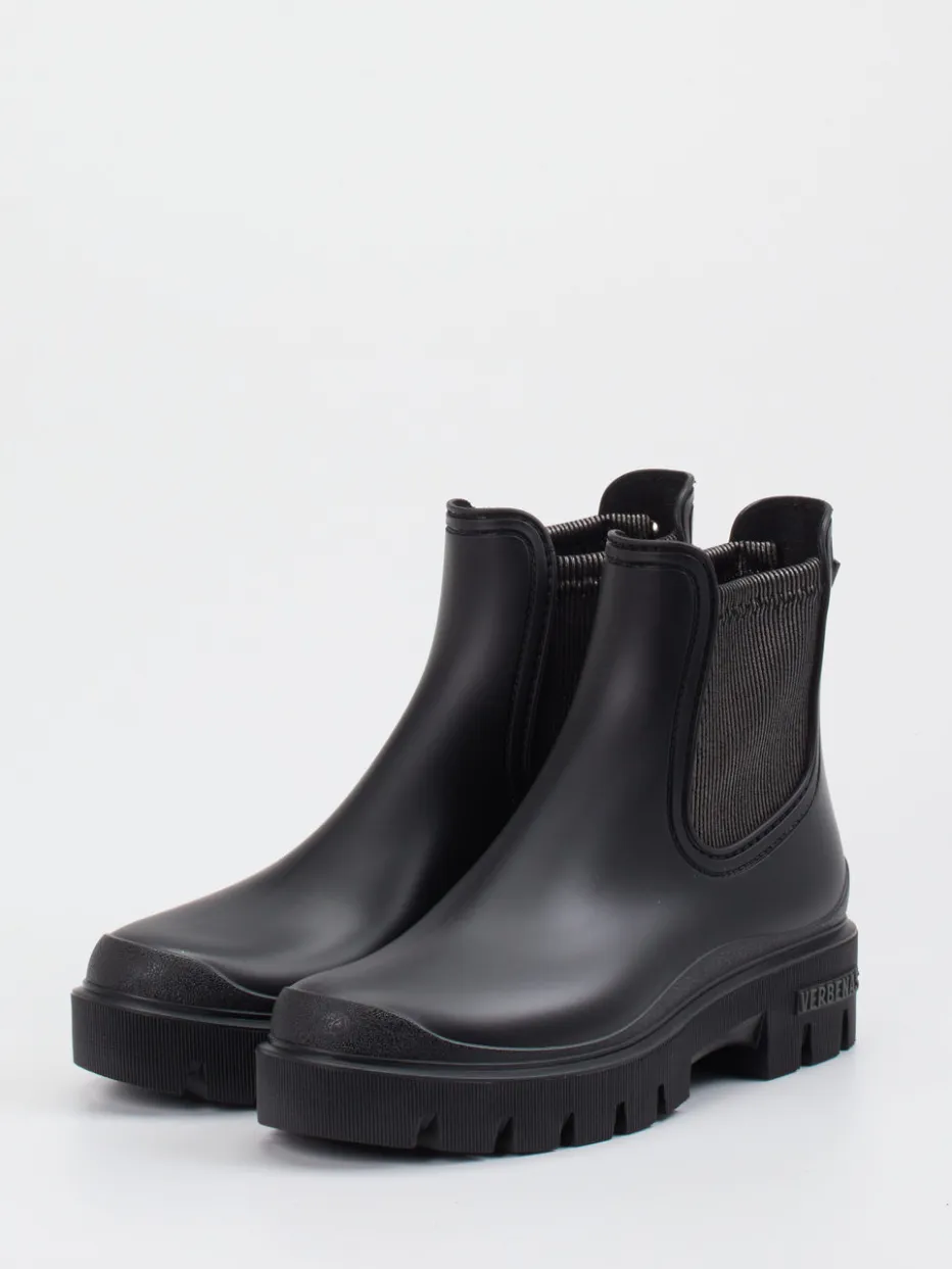 Stilsicher bei jedem Wetter.Verbenas präsentiert diese Damen-Chelsea Boots aus Gummi. Das Modell ist perfekt für urbane Outdoor-Momente an regnerischen Tagen. Das pflegeleichte Synthetikmaterial mit matter Gummioberfläche zeigt sich in tiefem Schwarz mit Ton-in-Ton-Elastikeinsätzen. Die klassische, knöchelhohe Form und die markante Profilsohle treffen auf minimalistische Designakzente wie eine strukturierte Zehenkappe und rückseitige Zuglasche. Funktionalität zeigt sich durch den wasserabweisenden Aufbau und die griffige Gummisohle – ideal für Freizeit und Outdoor. Das vegane Design unterstreicht den zeitgemäßen Utility-Trend. Verbenas vereint Lifestyle mit robuster Alltagstauglichkeit.