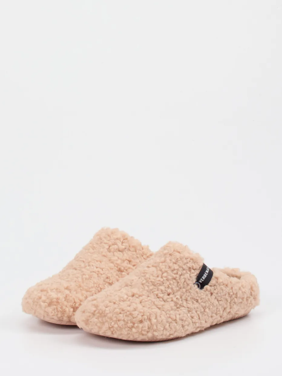 Soft-Comfort für entspannte Wintertage.Verbenas präsentiert klassische Mules als stylische Hausschuhe für den Alltag zuhause. Ideal für gemütliche Innenräume: Die beige-braunen Hausschuhe sind aus weichem Textil gefertigt und überzeugen mit flauschiger Teddyfell-Haptik. Das geschlossene Vorderblatt und die offene Fersenpartie sorgen für unkomplizierten Komfort. Innen wärmt gefüttertes Textil, während die profilierte Gummisohle sicheren Halt bietet. Das dezente Textiletikett mit Markenlogo unterstreicht den minimalistischen Look. Hygge-inspirierter Stil trifft auf Funktionalität – perfekt für alle Homewear-Begeisterten. Verbenas kombiniert Komfort und reduziertes Design zu zeitgemäßer Wohlfühlmode.
