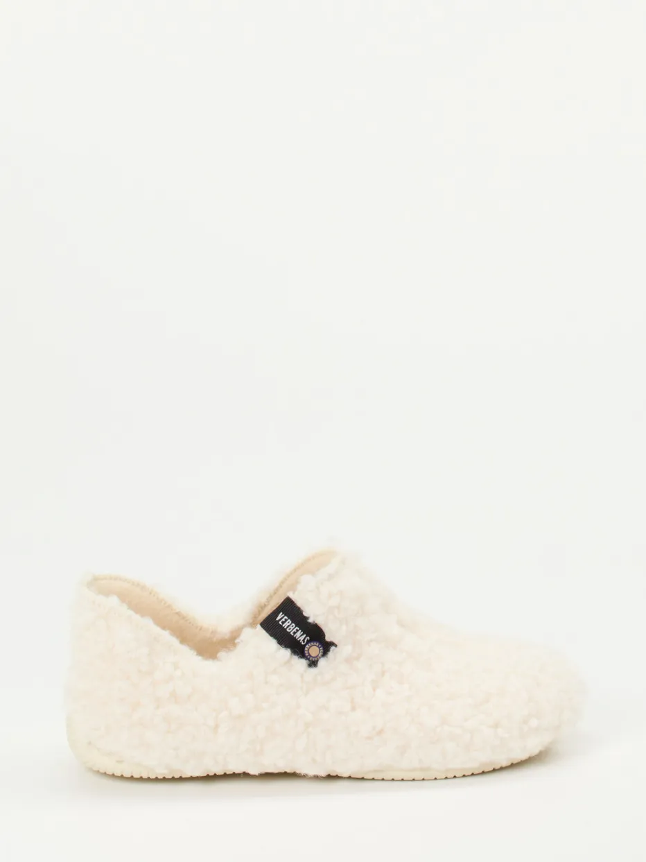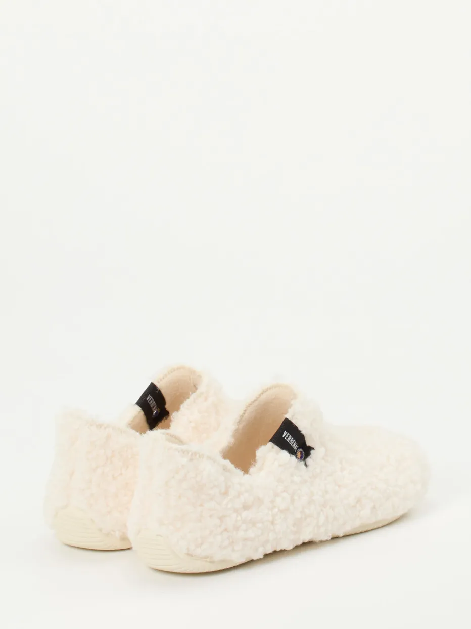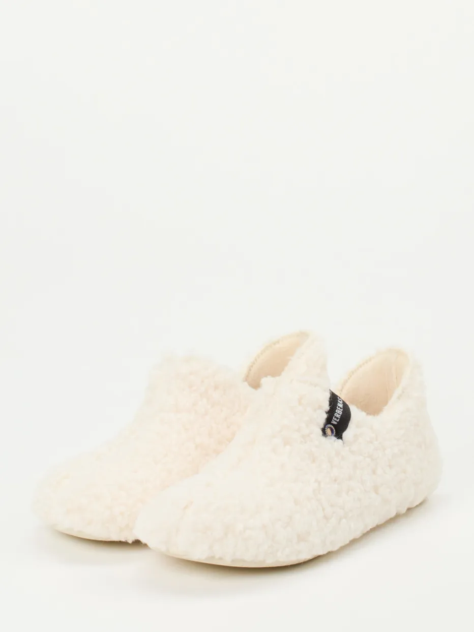 Wohnerlebnis mit Kuschelfaktor.Verbenas präsentiert diesen flauschigen Hüttenschuh aus der Kategorie Hausschuhe. Für entspannte Momente zu Hause bietet das Modell mit seinem samtig-wollweißen Teddyfleece ein herrlich behagliches Tragegefühl. Die geschlossene, rund geformte Silhouette mit elastischem Einstieg sorgt für perfekten Halt, während die leicht profilierte Gummisohle Stabilität auf rutschigen Böden gewährleistet. Minimalistische Details wie das seitlich aufgenähte Markenlabel unterstreichen die stilvolle Loungewear-Ästhetik. Ein echtes Highlight im „Coziness Core“-Trend, ideal kombinierbar mit Hausanzügen oder Kuscheldecken. Komfort und Design in harmonischer Balance – typisch Verbenas.
