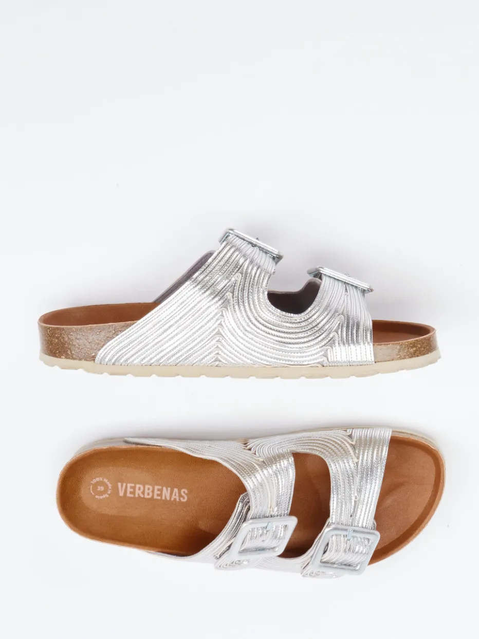Glanzstück für entspannte Sommermomente.Verbenas interpretiert die klassische Damen-Pantolette neu. Ideal für warme Tage in der Stadt oder entspannte Stunden am Strand: Die Zwei-Riemen-Pantolette von Verbenas kombiniert silberfarbenes Metallicleder mit glänzender, strukturierter Oberfläche im Wellenmuster. Das offen gehaltene Design mit verstellbaren Schnallen und ergonomischem Kork-Fußbett verspricht lässigen Komfort mit Stil. Die flache Gummisohle mit rutschhemmendem Profil sorgt für sicheren Halt. Perfekt für trendorientierte Looks im Metallic-Look – ob zu Leinen-Shorts oder Maxi-Kleid. Komfort trifft auf sommerliche Eleganz mit modischem Akzent.