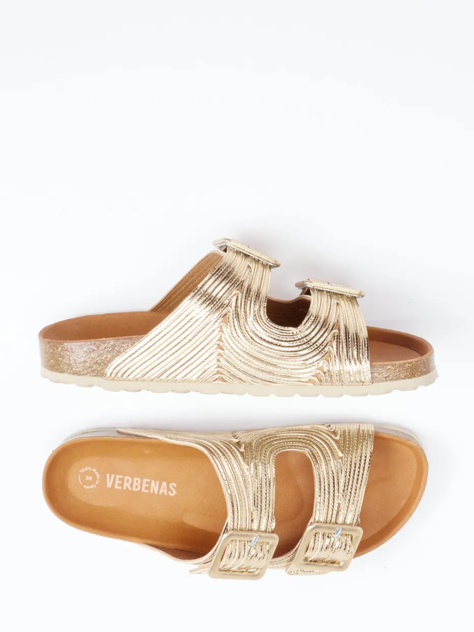 Minimalismus mit Glanzwirkung.Verbenas interpretiert die klassische Zweiriemer-Pantolette mit einem goldfarbenen Metallic-Finish neu. Ob Stadtbummel oder Strandpromenade – der schimmernde Look passt sich stilvoll an verschiedene Alltagsszenarien an. Die offene, flache Silhouette besteht aus synthetischem Metallicmaterial mit strukturierter Oberfläche, ergänzt durch ein ergonomisches Fußbett aus nachhaltigem Kork. Goldfarbene Schnallen setzen modische Akzente, während die rutschhemmende Gummisohle sicheren Halt bietet. Das Design orientiert sich am Retro-Stil der 70er und greift den Metallic-Trend der Saison auf. Kombiniert mit Leinen-Shorts und Strohtasche entsteht ein entspannter Sommerlook. Verbenas verbindet spanisches Design mit trendorientiertem Funktionalismus.