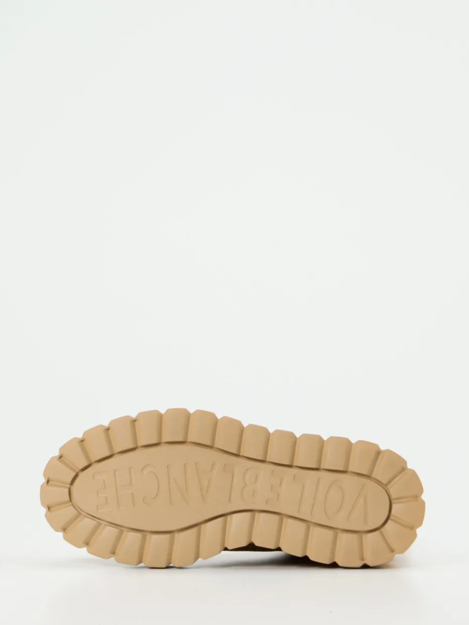 Ein strukturierter Alltag verlangt nach Schuhen, die Design und Komfort vereinen: Diese camelfarbenen Stiefeletten bestehen aus wertigem Veloursleder mit samtig-matter Oberfläche. Tonale Elastikeinsätze seitlich, sowie eine sanft gepolsterte Innensohle bieten angenehmen Tragekomfort. Die knöchelhohe Form wird durch eine markante, strukturierte Plateau-Sohle (2 cm) im Chunky-Look ergänzt – ein stilistisches Statement im Streetstyle-Kontext. Die dezente Logo-Schlaufe am Schaft und das monochrome Farbkonzept runden das Gesamtbild charakterstark ab. Perfekt kombinierbar mit oversized Wollmänteln und beigen Crossbody-Bags.