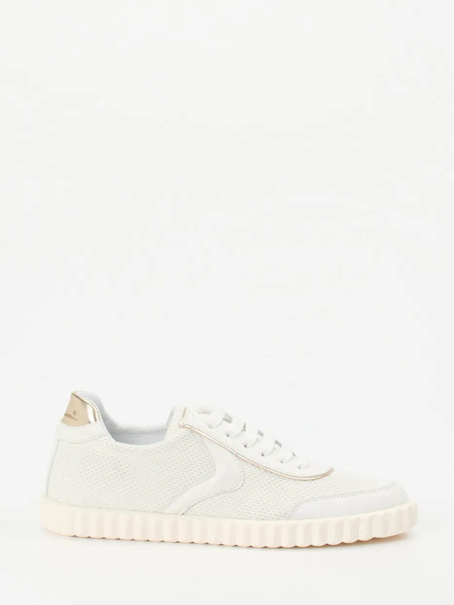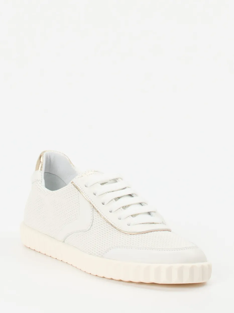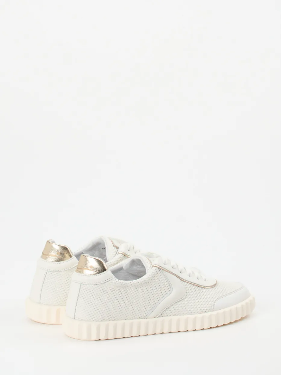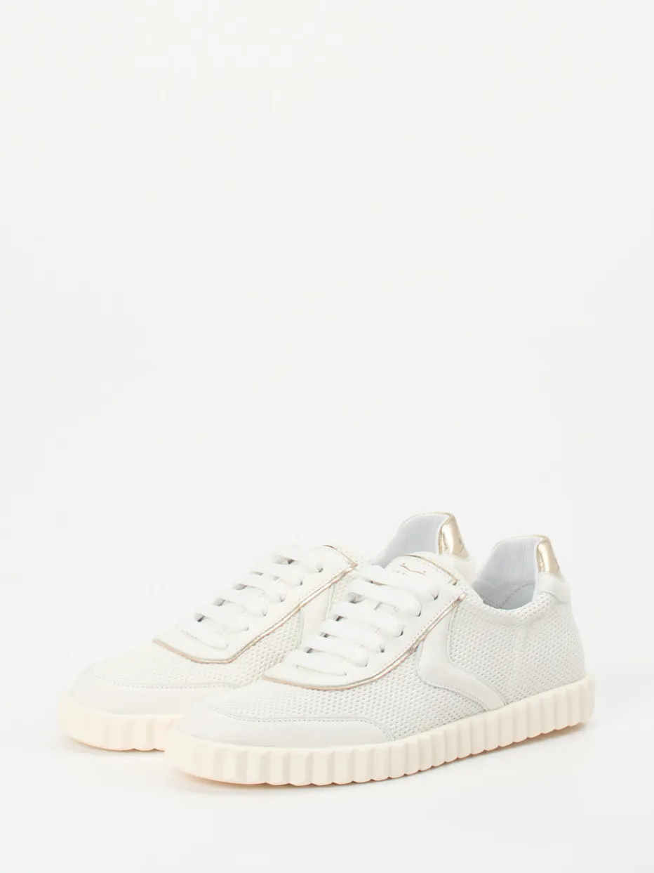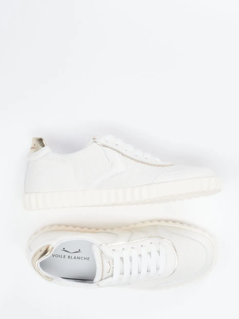 Leichtigkeit im Sommer-Look.Voile Blanche präsentiert einen Damen-Sneaker mit sportiv-elegantem Charakter für Frühjahr und Sommer. Ideal für entspannte Alltagsmomente in der Stadt oder auf Reisen überzeugt das Modell mit atmungsaktivem Mesh und samtigem Lammleder in Offwhite. Die klassisch flache Silhouette wird durch eine goldfarbene Fersenkappe und Ton-in-Ton-Nähte akzentuiert. Innen sorgt ein hochwertiges Kalblederfutter mit gepolstertem Wechselfußbett für besonderen Tragekomfort. Die geriffelte Gummisohle bietet Flexibilität und Bodenhaftung – perfekt für Streetwear-inspirierte „Quiet Luxury“-Looks. Ein subtiler Allrounder für stilbewusste Freizeitgarderoben.