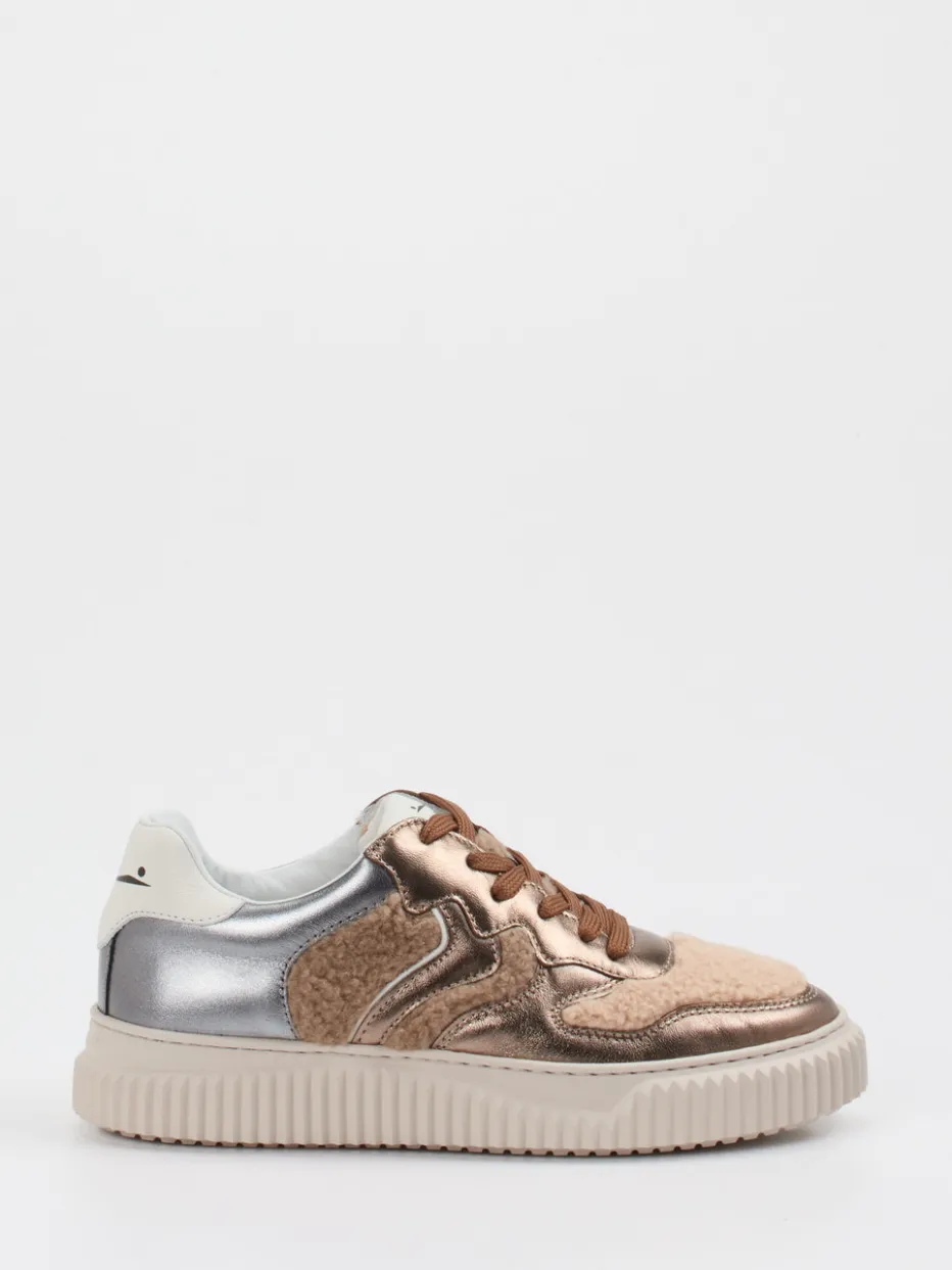 Bronzefarbenes Metallicleder bildet die glänzende Basis dieses Sneakers, während flauschiges Teddyfell an ausgewählten Partien einen spannenden Kontrast setzt. Die Farbwelt aus Roségold, Beige und Silber verleiht dem Schuh eine moderne Tiefe. Dank Schnürverschluss und gepolstertem Schaftrand bleibt der Tragekomfort im Fokus. Die geriffelte Gummisohle greift Retro-Runner-Vibes auf und macht ihn zum Highlight urbaner Herbst-Looks. Besonders stimmig mit Oversized-Jacken oder Metallic-Accessoires.