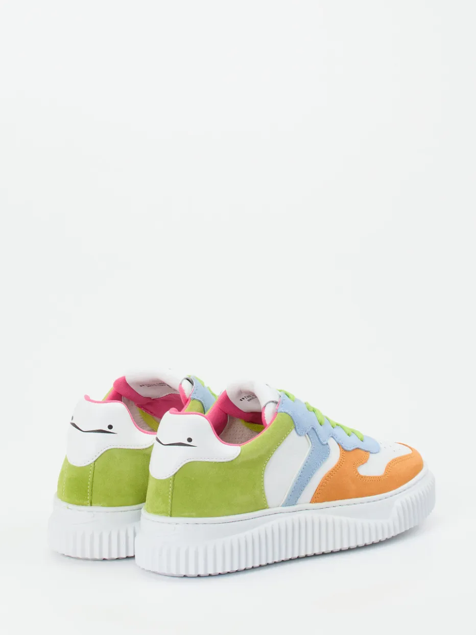 Mit einer Kombination aus weißem Glattleder und farblich abgesetzten Overlays aus Veloursleder in Orange, Hellblau, Limettengrün und Pink zeigt der Schuh ein markantes Color-Blocking im Y2K-Stil. Die runde Silhouette mit voluminöser Gummisohle, gepolsterter Einstieg und perforierte Zehenkappe sorgen für Tragekomfort und visuelle Dynamik zugleich. Inspiriert durch Retro-Designs und Streetwear, passt dieses Modell ideal zu lässigen, modernen Looks. Weiße Sportsocken oder eine Crossbody-Bag ergänzen den Auftritt perfekt.