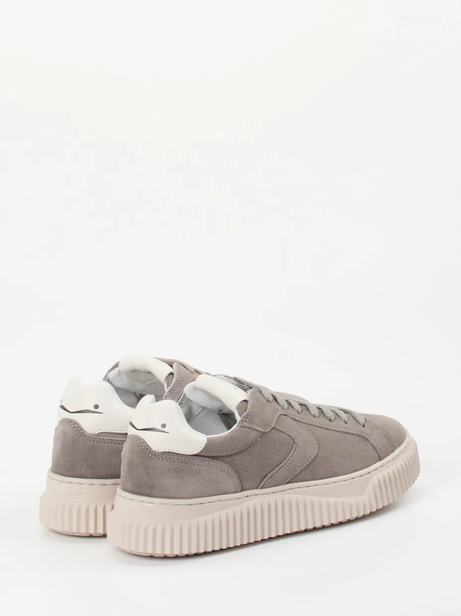 Schlichte Eleganz im urbanen Design.Die Marke Voile Blanche präsentiert diesen stilvollen Sneaker für den Alltag. Aus bleigrauem, samtig angeschliffenem Veloursleder gefertigt, wirkt der Low-Top-Sneaker klar und modern. Die kontrastierende Fersenkappe aus cremeweißem Glattleder sowie tonale Steppnähte setzen dezente Akzente. Das Innenfutter aus weichem Kalbleder sorgt für angenehmen Tragekomfort, während die profilierte Plateausohle mit gezacktem Rand dem minimalistischen Design eine modische Streetwear-Note hinzufügt. Idealer Begleiter zu cleanen Office-Looks und entspannten Freizeit-Outfits. Ein Sneaker für stilsichere Auftritte mit maximaler Alltagstauglichkeit.