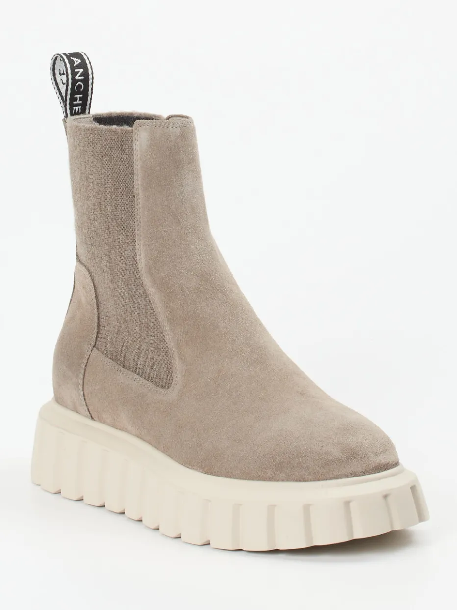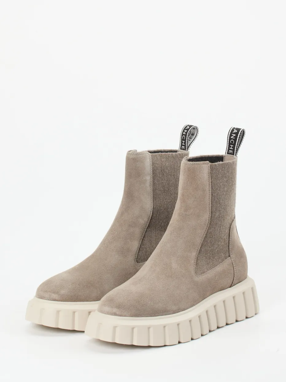 Ob Großstadtbummel oder Büroalltag – dieser Boot überzeugt durch seinen modernen Charakter und klare Linienführung. Das graue Veloursleder besitzt eine samtig-matte Oberfläche, ergänzt durch tonale Elastikeinsätze und eine praktische Textilzuglasche. Die Farbgebung in Taupe mit cremeweißer, profilierter Plateau-Gummisohle wirkt ruhig und doch ausdrucksstark. Die markante Chunky-Silhouette ist von aktuellen Laufstegtrends inspiriert und verleiht urban-stylischen Outfits ein charakterstarkes Finish. Perfekt zu Oversized-Mänteln oder Strickkleidern für den Herbst.