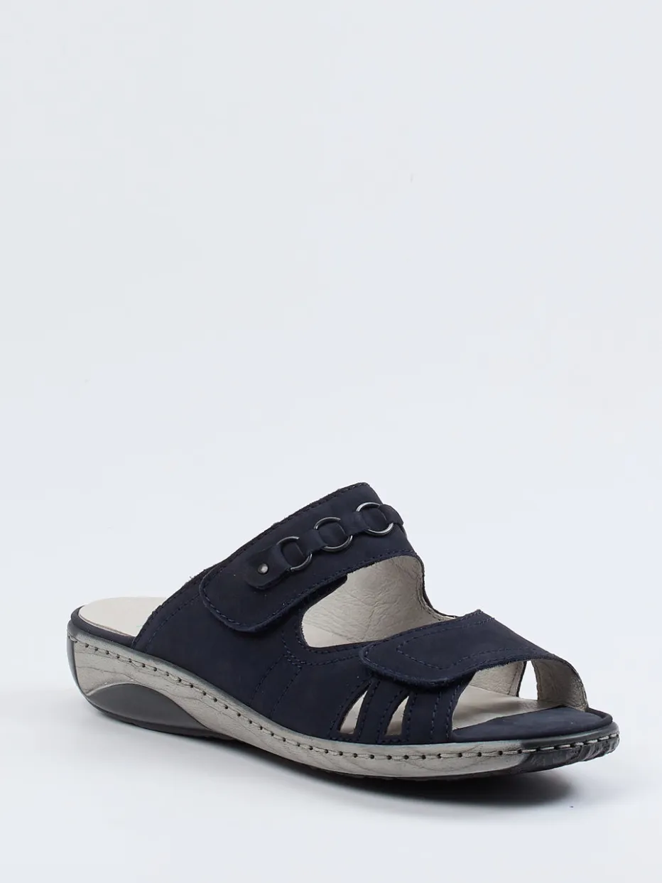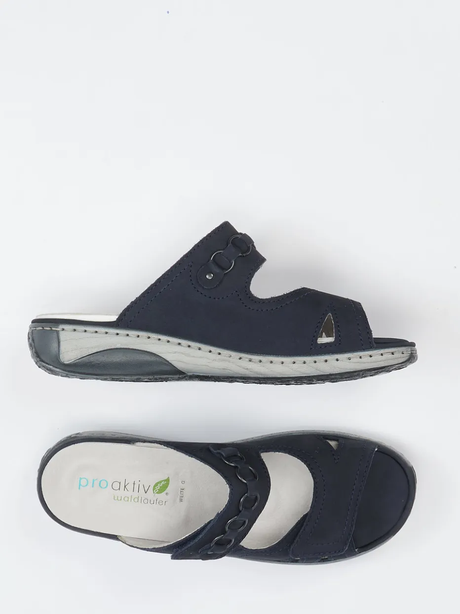 Komfort trifft auf Alltagstauglichkeit.Die Marke Waldläufer präsentiert mit dieser Komfort-Pantolette ein durchdachtes Damenmodell für entspannte Sommertage. Die ergonomisch geformte Sohle bietet unterstützenden Halt – ideal für Zuhause oder entspannte Wege unterwegs. Gefertigt aus samtig angeschliffenem Nubukleder in elegantem Dunkelblau überzeugt sie durch zwei praktische Klettriemchen für flexible Passform. Das kleine Kettchendetail am oberen Riemen verleiht dem funktionalen Design einen femininen Akzent. Die leicht profilierte PU-Sohle zeigt sich rutschhemmend und bewährt sich auch bei längeren Tragezeiten. Das Wechselfußbett und die weiche Lederfütterung unterstreichen den Anspruch an Komforttypik der Marke.