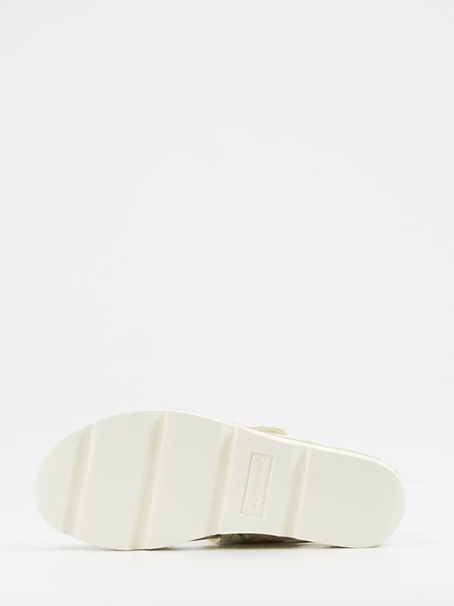 Florales Design trifft ergonomischen Komfort.Waldläufer präsentiert mit dieser Komfort-Sandale ein Modell für den Sommer, das funktionales Gehen und entspanntes Styling miteinander vereint. Bunte Nature Prints auf geprägtem, matt strukturierter Lederfläche prägen das Design, ergänzt durch einen geflochtenen Jutebesatz entlang der weißen Plateausohle. Die offene, ergonomisch geformte Silhouette überzeugt durch Klettverschlüsse und eine gepolsterte, herausnehmbare Ledereinlage. Farblich bleibt das Modell mit seinem mehrfarbigen Print lebendig, dabei stilvoll zurückhaltend mit cremeweißer Grundnote. Rutschhemmung, Weite H und Boho-Vibes machen die Sandale sommertauglich – ob in der Stadt oder am Meer. Ein Wohlfühlmodell mit klarer Designhandschrift von Waldläufer.