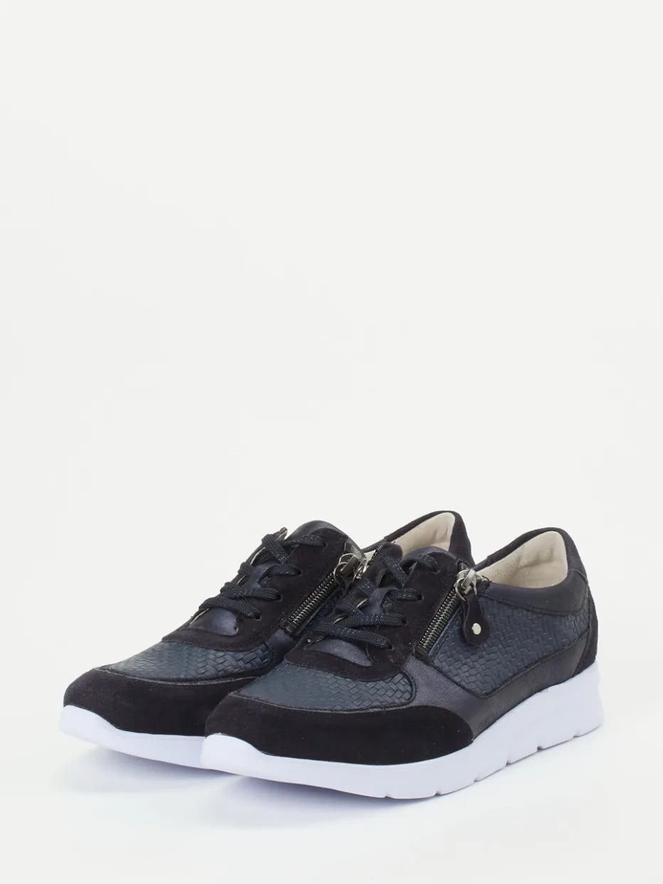 Leichtfüßig unterwegs im Alltag.Der Komfort-Sneaker von Waldläufer überzeugt als stilvoller Begleiter für entspannte Freizeitmomente. Die Kombination aus dunkelblauem Kalbleder mit samtig angeschliffenen Veloursleder-Partien und geprägter Flechtstruktur verleiht dem Schuh Tiefe und Charakter. Die klassische, niedrig geschnittene Silhouette wird durch seitliche Reißverschlüsse ergänzt, die ein komfortables Hineinschlüpfen ermöglichen. Eine helle PU-Sohle mit ergonomischem Profil unterstreicht den sportiv-relaxeden Look und sorgt für angenehme Dämpfung beim Gehen. Dezente Glanzelemente fügen sich harmonisch ins Gesamtbild ein. Ein Schuh für jeden Tag – mit Fokus auf Bequemlichkeit, Passform und stilvoller Zurückhaltung.