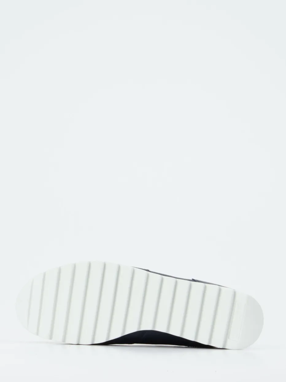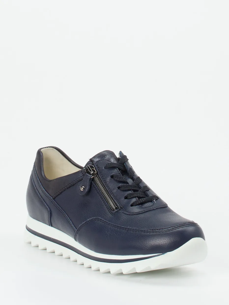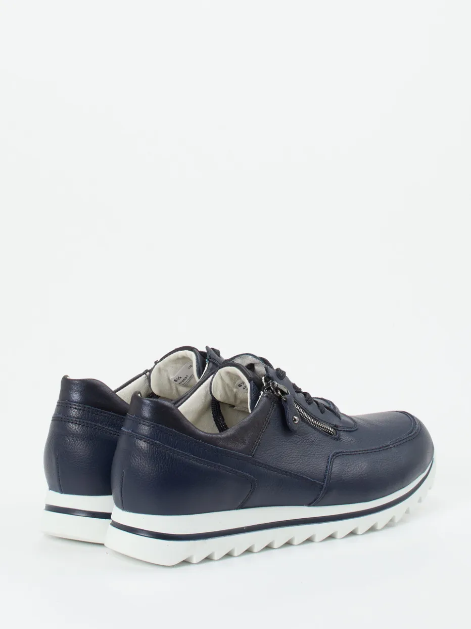 Durch das dunkelblaue, natürlich genarbte Kalbleder wirkt der Schuh sportiv und dezent zugleich. Die Kombination aus toniger Schnürung und praktischem Reißverschluss erleichtert das Anziehen. Die weiße Zickzack-Profilsohle mit silberfarbenem Akzent sorgt für sicheren Halt; das gepolsterte Innenleben mit Leder-/Textilfutter erhöht den Tragekomfort. Sein klassisch-sportlicher Schnitt harmoniert mit Freizeit-Outfits und eignet sich ideal für komfortorientierte Looks.