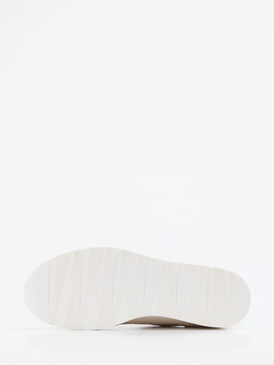 Die Kombination aus weichem Hirsch-/Elchleder und genarbter Oberfläche sorgt für ein edles Finish sowie ein angenehmes Tragegefühl. Das cremeweiße Obermaterial mit champagnerfarbenen Details wirkt harmonisch und zurückhaltend, während metallische Akzente an der Ferse für einen modernen Twist sorgen. Schnürung und ein silberfarbener Reißverschluss erleichtern das An- und Ausziehen. Die Keilsohle bietet eine sanfte Erhöhung und wirkt zugleich dämpfend. Ideal für stilbewusste Frauen, die Komfort schätzen.