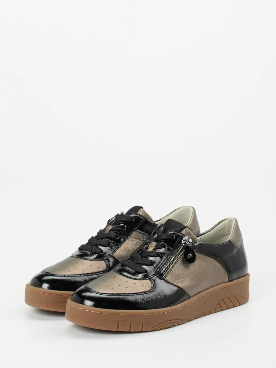 Facettenreich glänzender Alltagsbegleiter.Der Komfort-Sneaker für Damen von Waldläufer verbindet modischen Metallic-Style mit funktionaler Alltagstauglichkeit und angenehmer Weite H. Für entspanntes Unterwegssein bietet das Modell eine genarbte, glänzende Oberfläche in Bronzebraun und Schwarz auf Basis von Metallicleder. Der Mix aus Schnürung und seitlichem Reißverschluss erleichtert den Einstieg, während Textil- und Lederfutter sowie das gepolsterte Fußbett den Komfort unterstreichen. Die rutschhemmende Honig-Gummisohle ergänzt die klassische Rundform, während dezente Metallic-Akzente, Perforationen im Vorderblatt und ein weich gepolsterter Schaftrand stilvolle Details bieten. Der Look greift aktuelle „Comfort Revival“- und „Metallic Accents“-Trends auf. Waldläufer-typischer Komfort trifft hier auf zurückhaltende Modernität.