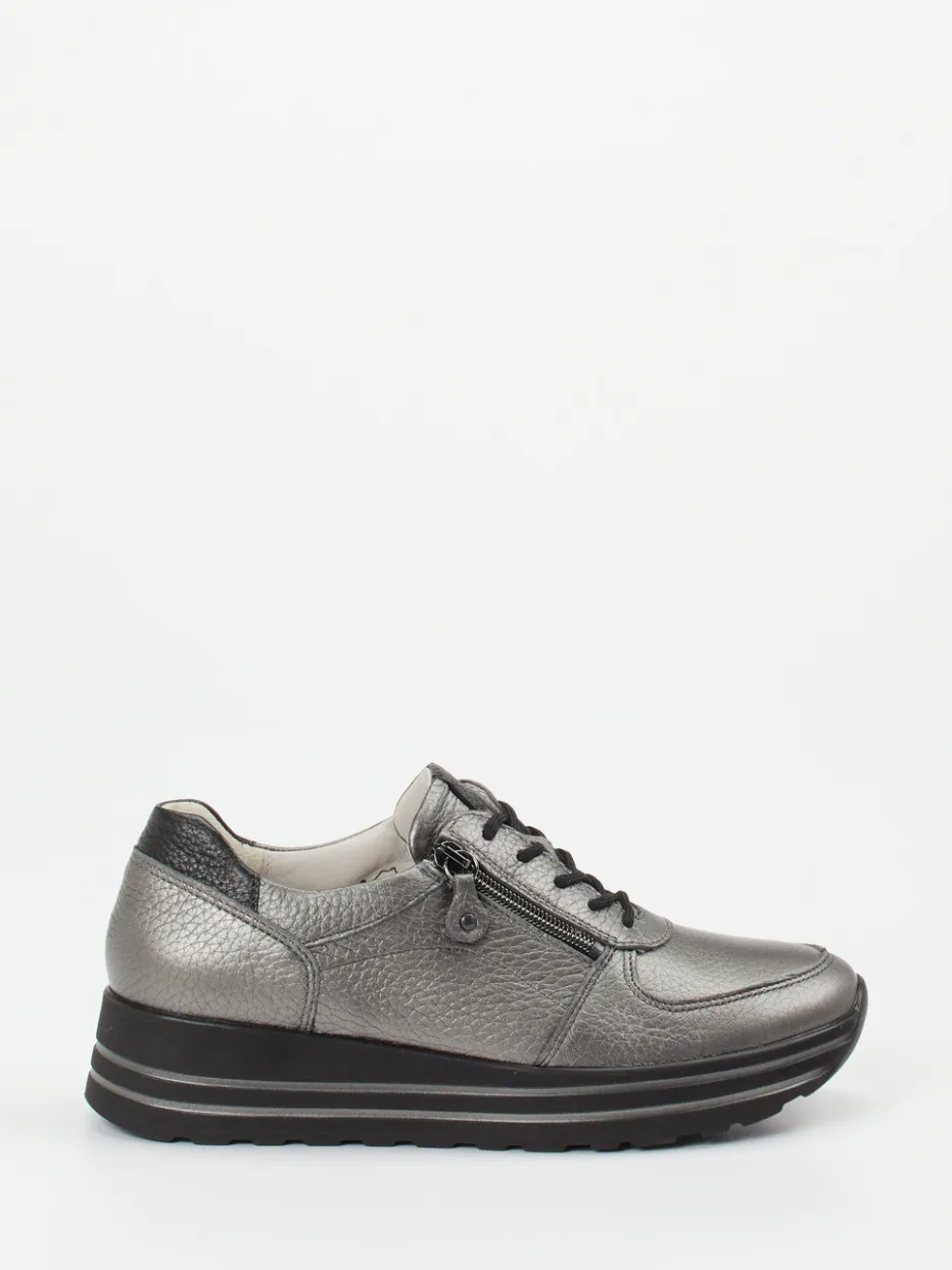 Metallic-Glanz trifft Komfort-Technologie.Waldläufer präsentiert einen Damen-Sneaker in der Kategorie Komfortschuhe. Dieser anthrazitgraue Sneaker überzeugt mit genarbtem Metallicleder und weich gepolstertem Leder-/Textilfutter – ideal für lange Tage mit hohem Trageanspruch. Die Kombination aus klassischer Rundform, dämpfender Gummisohle mit silberfarbenen Akzenten und der seitliche Reißverschluss ergänzen sich zu einem praktischen wie modischen Gesamtpaket. Schwarze Kontrastdetails an Ferse und Schnürung verleihen dem minimalistisch inspirierten Modell eine moderne Streetwear-Note. Dank Weite H und herausnehmbarem Fußbett eignet er sich auch für Einlagen. Vielseitiger Komfortschuh mit dezenter Fashion-Attitüde – typisch Waldläufer.